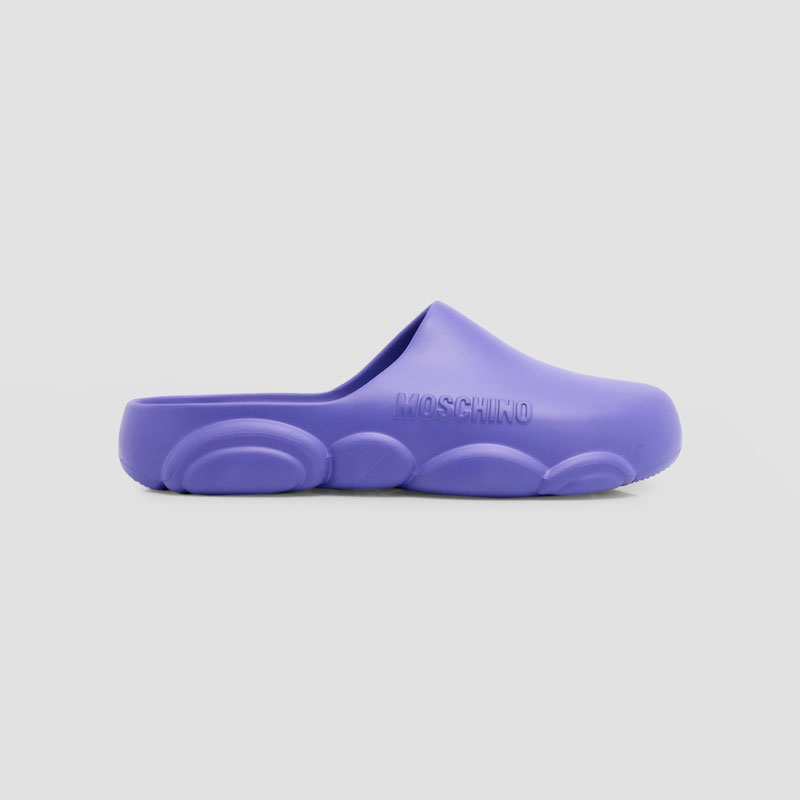 Moschino Teddy-Sole slide assina um modelo versátil que conecta lazer e smart casual, consolidando um visual polido para dias ensolarados.