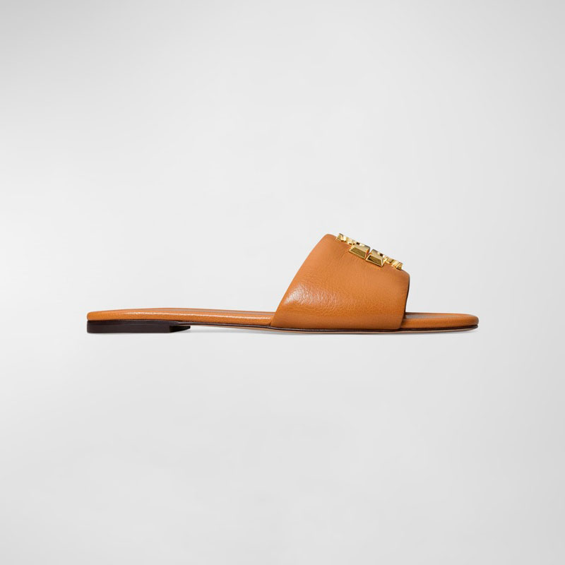 Tory Burch Eleanor Medallion Slide combina frescor de temporada e rigor de atelier. A peça revela um olhar contemporâneo sobre sandálias de luxo, em equilíbrio entre delicadeza e atitude.