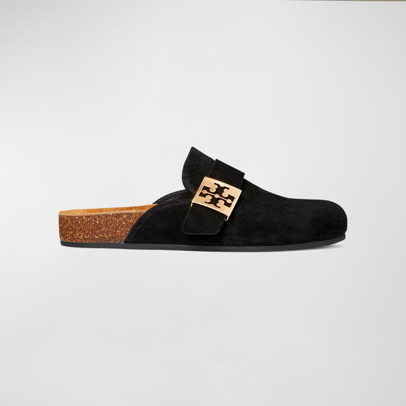 Tory Burch Mellow Suede Buckle Slide traz frescor à categoria com proporção impecável.