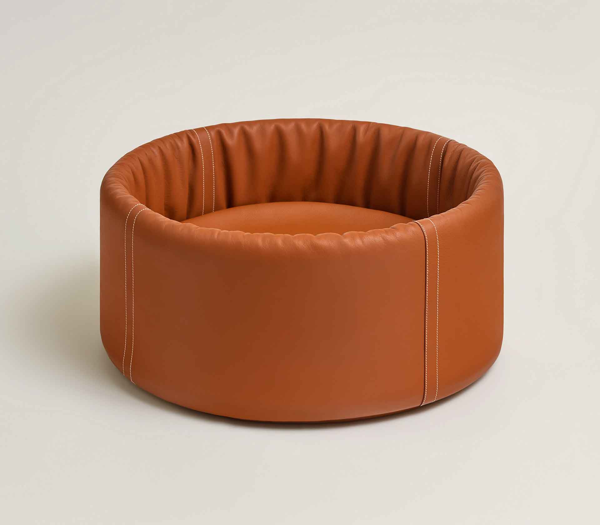 Construída com couro de alta qualidade, a Cama Patapouf exemplifica a habilidade da Hermès em trabalhar com materiais de luxo. O couro utilizado é escolhido por sua durabilidade e textura agradável, garantindo que a cama não só seja resistente ao uso diário, mas também extremamente confortável para o pet. Este couro proporciona uma superfície suave e convidativa, perfeita para que os animais de estimação possam relaxar e descansar.
