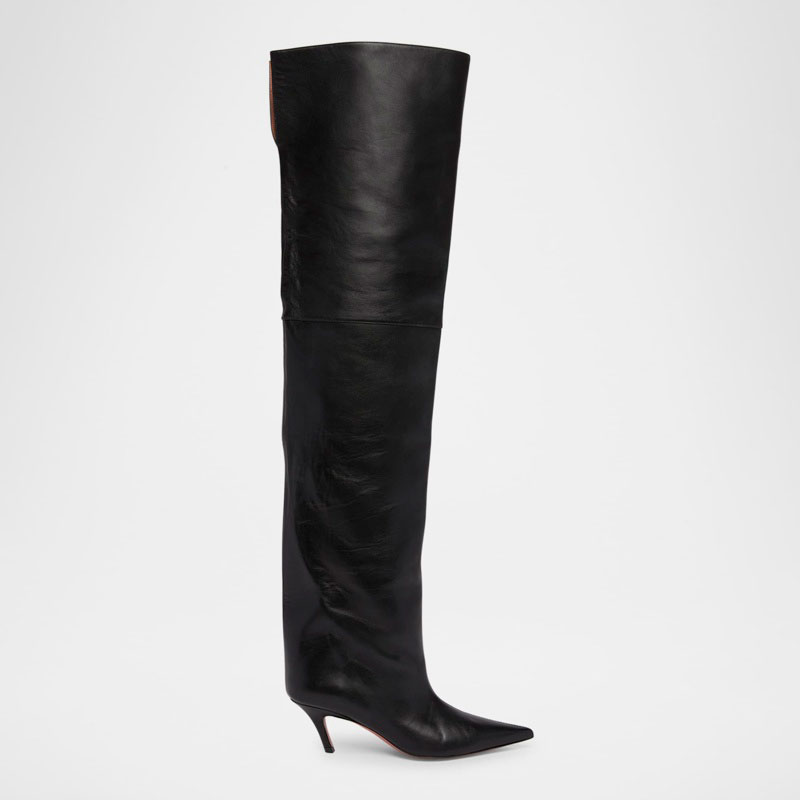 Amina Muaddi apresenta o Sapato Fiona Over-The-Knee, bota feminina construída para unir presença e versatilidade. O desenho revela assinatura de design da marca. Funciona do look urbano ao dress code...