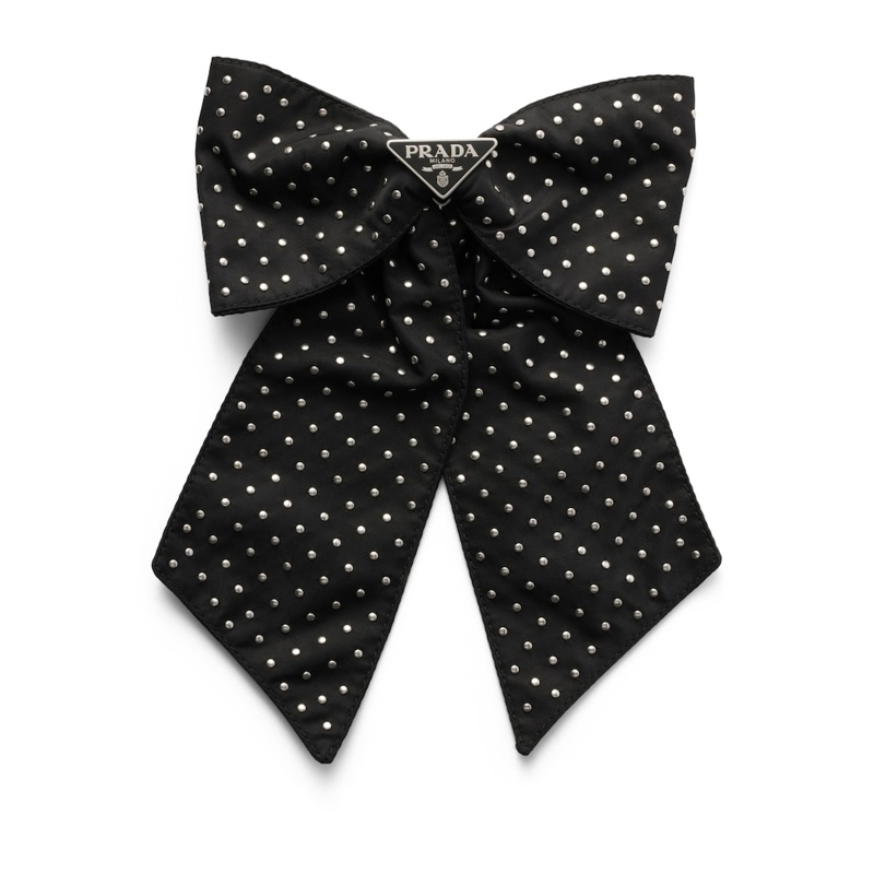 O design em forma de laço, cravejado com detalhes metálicos, reflete a habilidade da Prada em transformar materiais inesperados em símbolos de status. Seja para segurar um coque despojado ou adornar cabelos soltos, este grampo é versátil o suficiente para transitar entre o casual e o formal, oferecendo um equilíbrio perfeito entre funcionalidade e estilo. É o tipo de peça que eleva o cotidiano com um toque de irreverência.