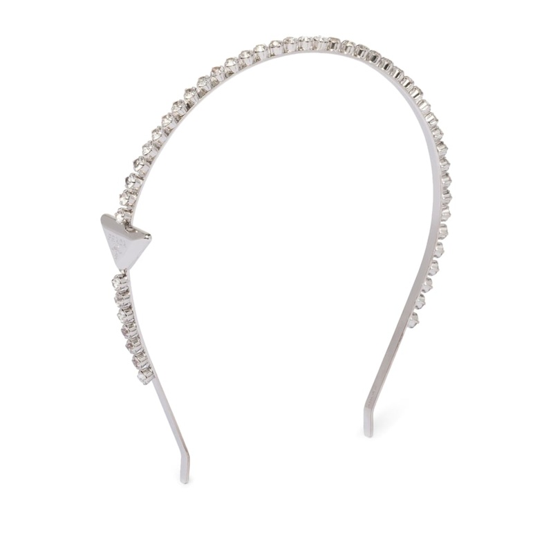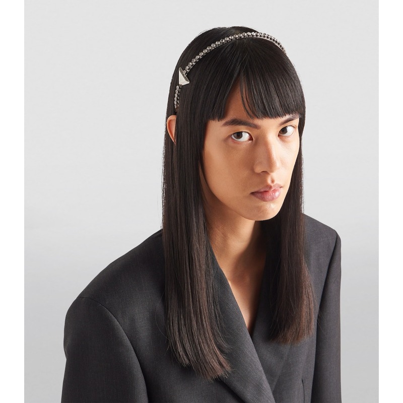 O design desta faixa é uma masterclass em equilíbrio. Os cristais cuidadosamente posicionados capturam a luz com um brilho sutil, enquanto a base estruturada garante um ajuste confortável que mantém os cabelos no lugar sem esforço. O logotipo Triângulo, um emblema de qualidade desde 1913, adiciona uma assinatura discreta, mas poderosa, que fala da herança da Prada. É o acessório perfeito para a mulher que deseja infundir seus looks com um toque de luxo sem sacrificar a praticidade.