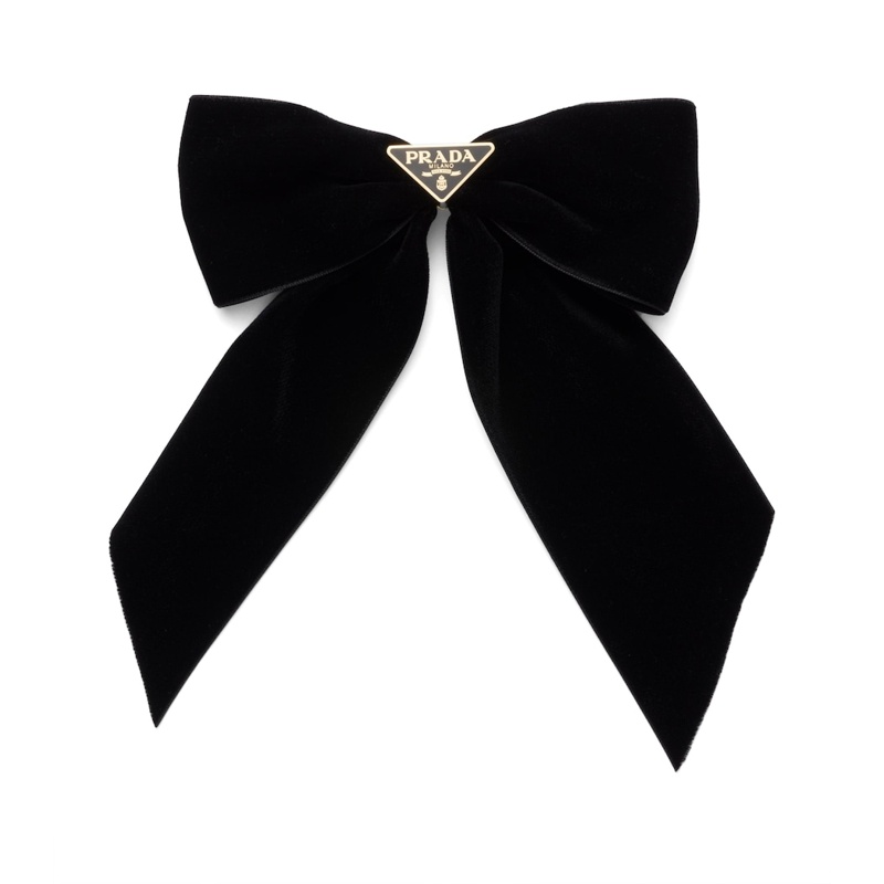 O veludo, com seu brilho sutil e textura rica, é cuidadosamente moldado para criar um laço que emoldura o penteado com sofisticação. A silhueta delicada, combinada com a assinatura minimalista da maison, garante que esta presilha seja versátil o suficiente para complementar desde vestidos de gala até jeans e camisetas. É o tipo de acessório que não apenas segura os cabelos, mas também conta uma história de luxo e inovação, características que definem o legado de Miuccia Prada.