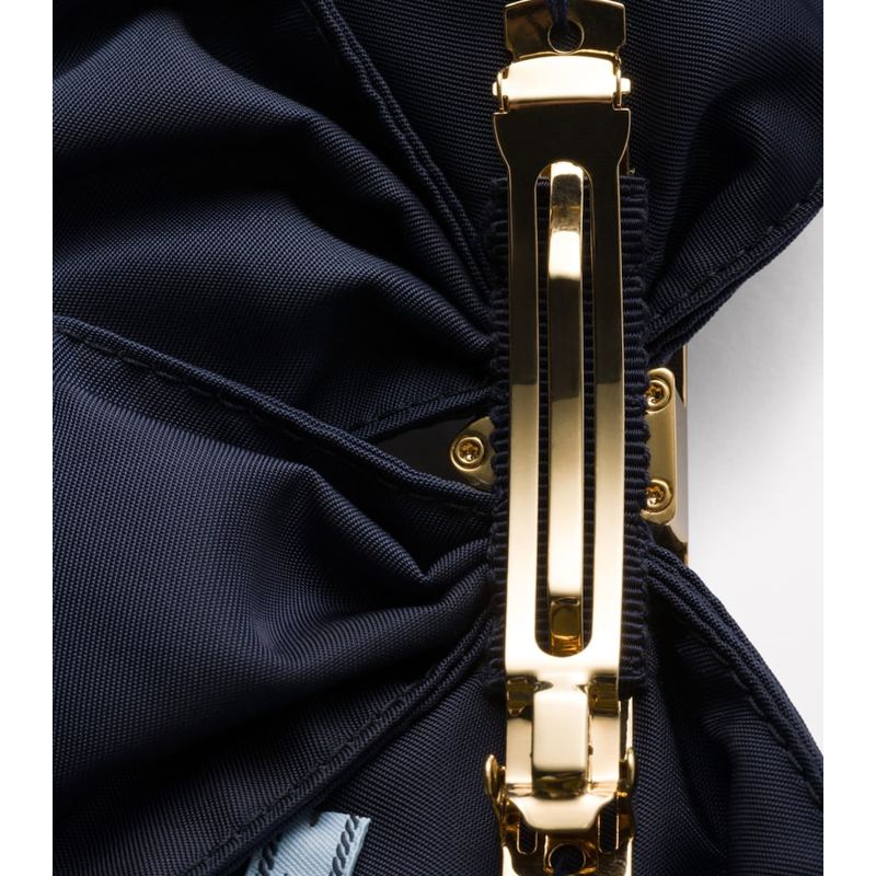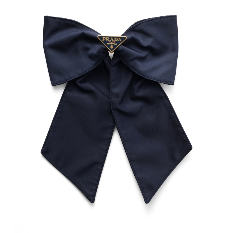 A construção leve e durável do grampo garante um ajuste seguro, enquanto o material reciclado reforça o compromisso da Prada com a sustentabilidade sem sacrificar o estilo. O laço delicado, combinado com a assinatura da maison, cria um equilíbrio perfeito entre ousadia e elegância. Com este acessório, a Prada convida você a fazer uma declaração de estilo que é tão ecológica quanto sofisticada.