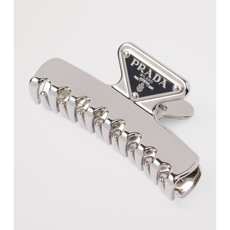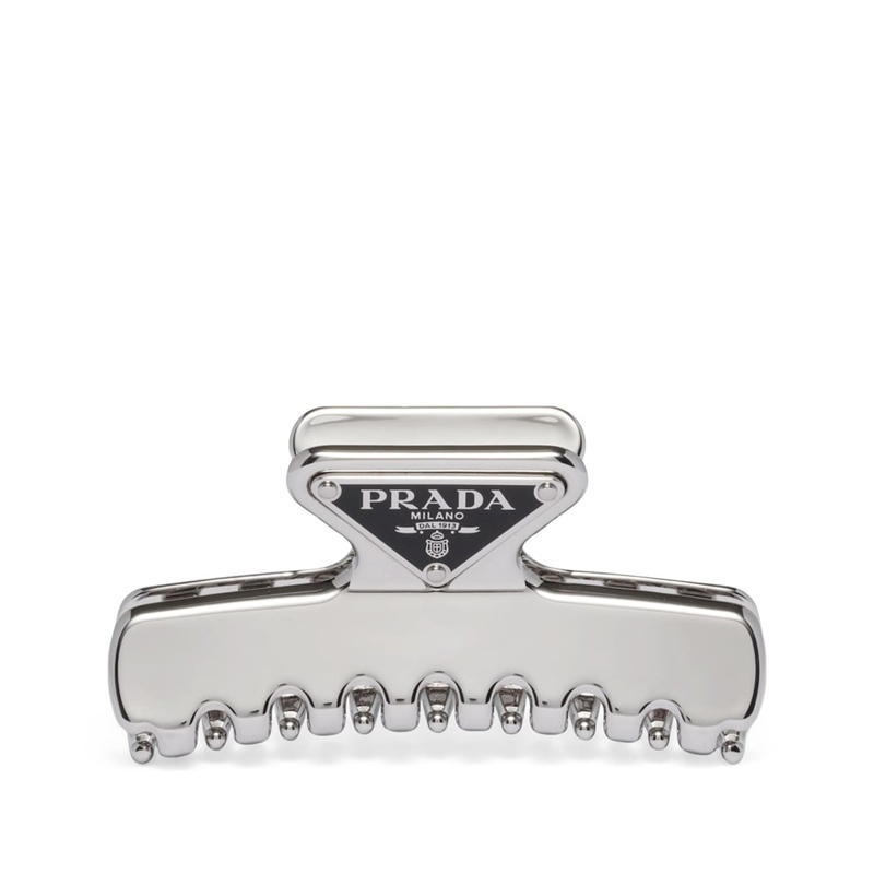O clipe de garra com logotipo triangular da Prada é uma celebração do icônico símbolo da maison, redesenhado por Massimo Vignelli em 1977, que eleva qualquer penteado com sofisticação minimalista....