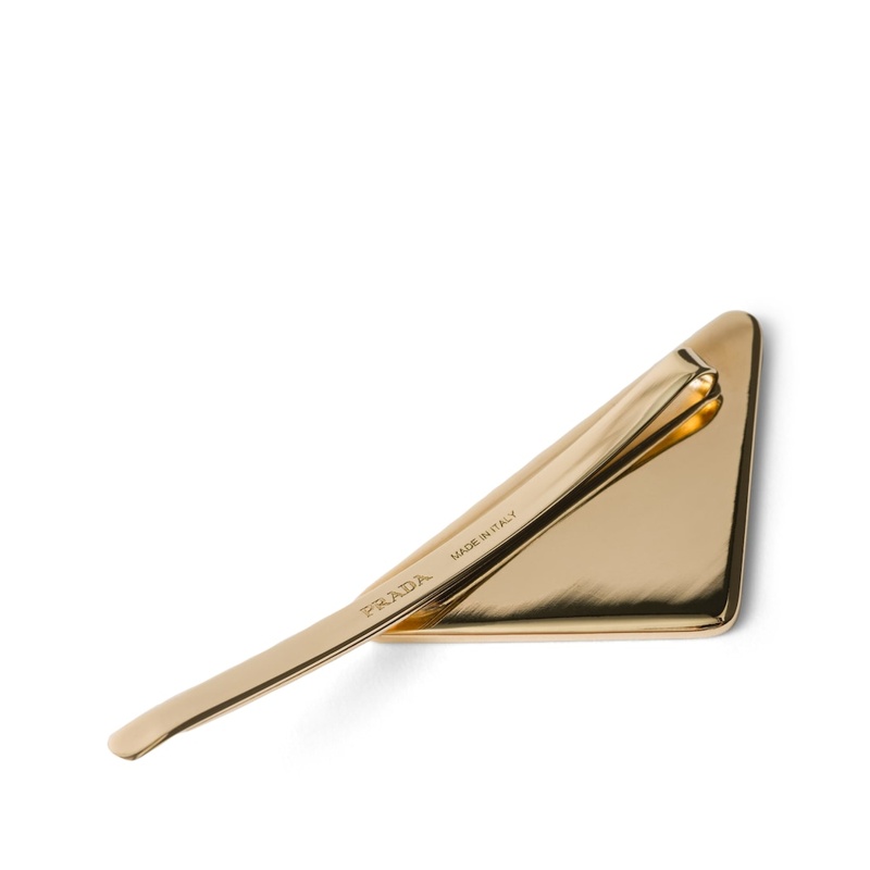 Cada grampo é meticulosamente trabalhado em metal polido, com o logotipo triangular gravado com precisão, garantindo um toque de elegância que complementa qualquer look, do casual ao formal. A estética clean e geométrica reflete a visão de Miuccia Prada de unir tradição e inovação, criando peças que são ao mesmo tempo atemporais e modernas. Seja para segurar uma mecha solta ou destacar um coque elegante, esses grampos são um convite para incorporar a energia distinta da Prada em cada detalhe do seu visual.