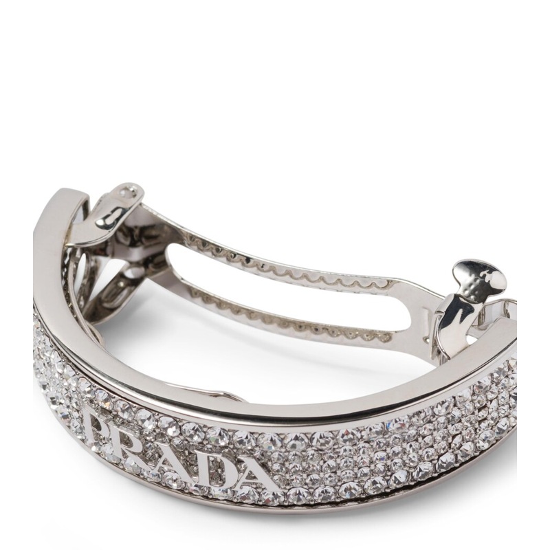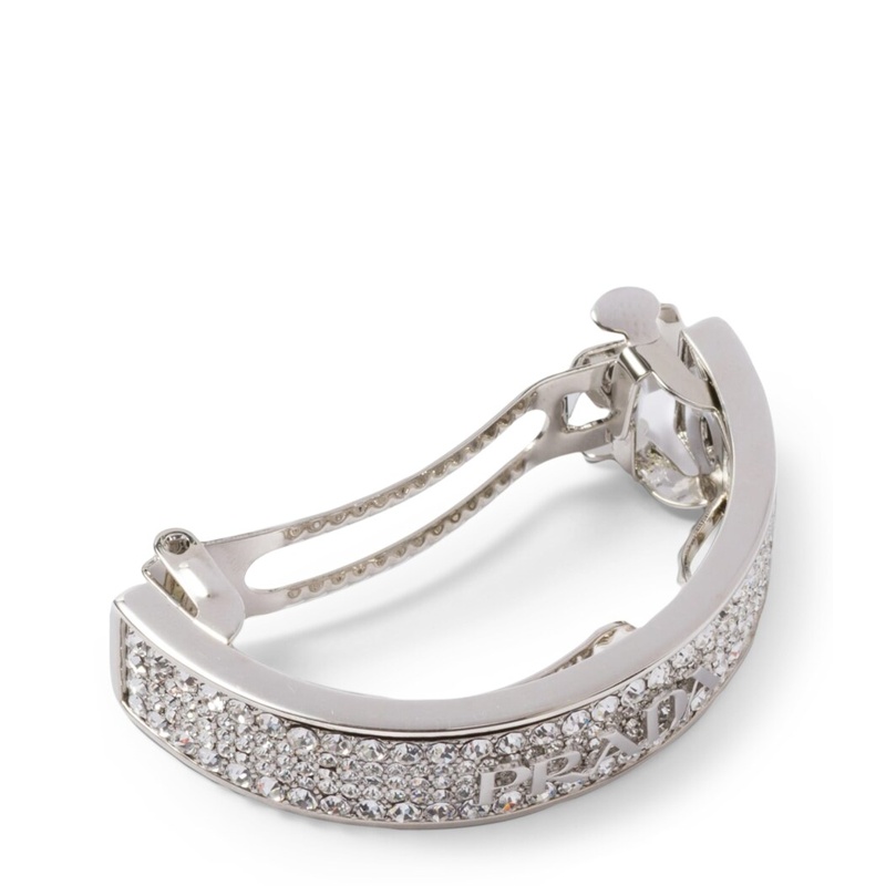 Projetado para oferecer funcionalidade e durabilidade, o grampo apresenta um fecho robusto que garante um ajuste seguro, mesmo em penteados complexos. O acabamento artesanal e os materiais de alta qualidade asseguram um brilho duradouro, enquanto o logotipo da Prada adiciona um toque de exclusividade. Com esta peça, a maison convida você a incorporar o luxo em cada detalhe do seu visual.