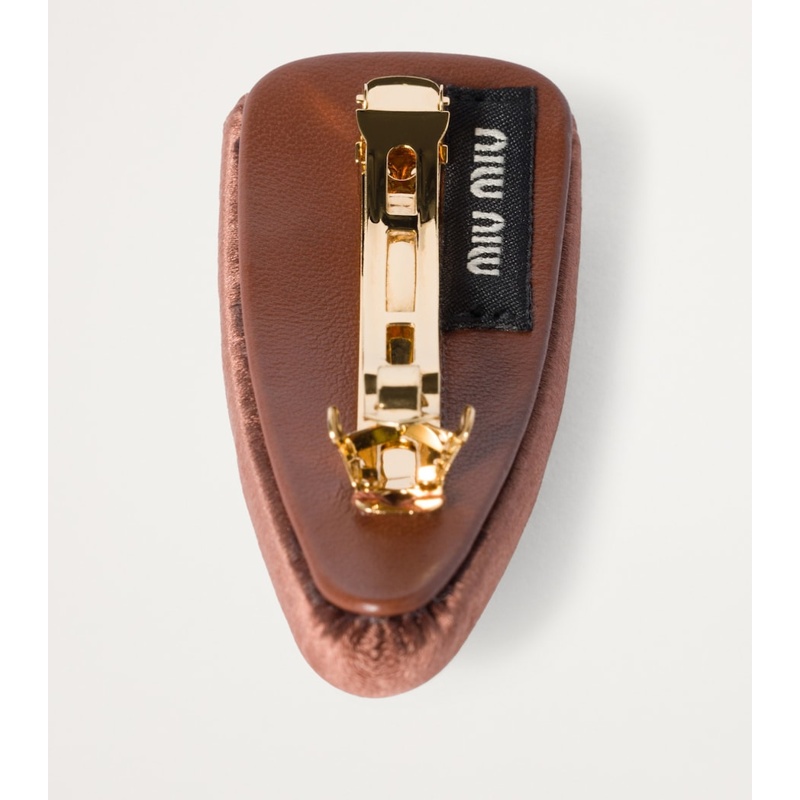 Trabalhado com precisão artesanal, o grampo apresenta a textura brilhante do cetim, que contrasta com o logotipo dourado, criando um efeito visual que eleva qualquer look. Versátil o suficiente para segurar mechas soltas ou complementar um coque elegante, este acessório é perfeito para ocasiões que vão do dia a dia a eventos especiais. O design reflete a visão da Miu Miu de unir diversão e sofisticação, oferecendo um toque final que é inconfundivelmente italiano.