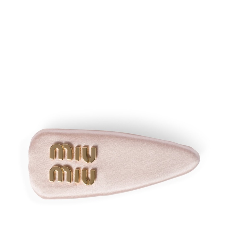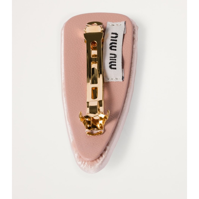 Projetado para oferecer conforto e funcionalidade, o grampo possui um fecho robusto que garante um ajuste seguro, mesmo em penteados complexos. O cetim de alta qualidade e o acabamento artesanal asseguram durabilidade e um toque de exclusividade, enquanto o logotipo dourado adiciona uma assinatura de prestígio. Com esta peça, a Miu Miu convida você a expressar sua individualidade com um toque de glamour jovial.