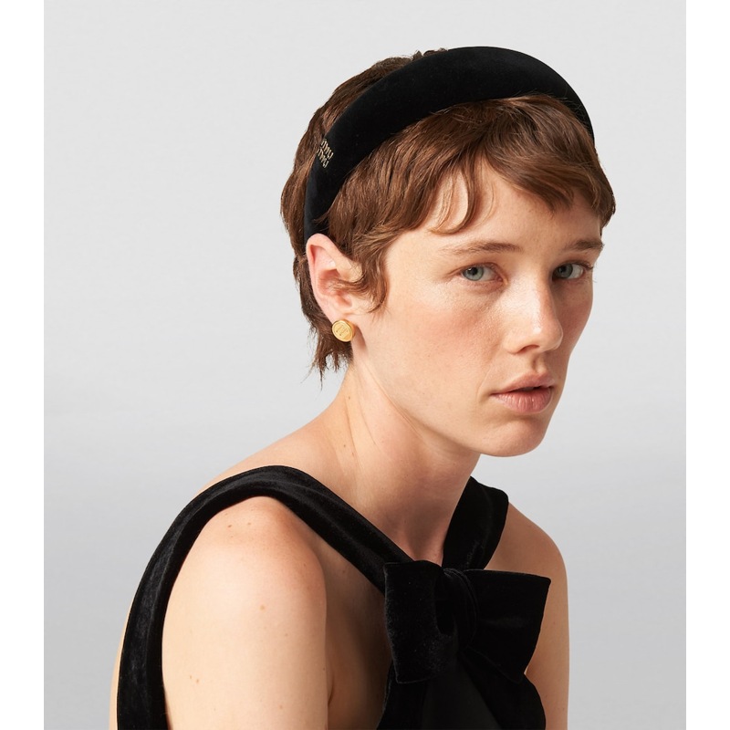 A faixa de cabeça com logotipo de veludo da Miu Miu é uma celebração do espírito jovial e audacioso da marca, com um design oversized que exsuda glamour descontraído. Confeccionada em veludo macio, esta peça é adornada com um logotipo dourado que adiciona uma assinatura sutil de sofisticação, tornando-a indispensável para a it girl moderna. Alinhada com a tendência de acessórios volumosos de 2025, ela é perfeita para quem deseja completar qualquer look com um toque de charme irreverente.
