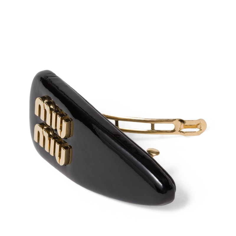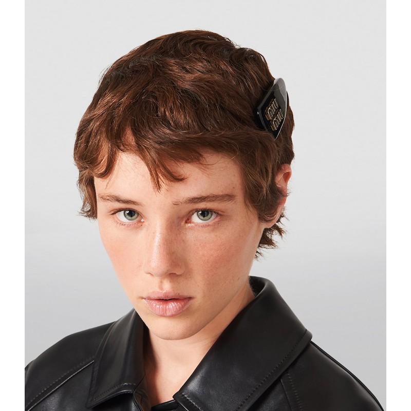 Trabalhada com precisão artesanal, a presilha combina a textura rica do couro com o brilho sutil das ferragens douradas, criando um contraste que adiciona profundidade a penteados casuais ou elaborados. Seja para segurar um coque despojado ou adornar cabelos soltos, esta peça é versátil o suficiente para transitar entre ocasiões diurnas e noturnas. O design reflete a habilidade da Miu Miu em unir nostalgia e modernidade, oferecendo um acessório que é ao mesmo tempo divertido e elegante.