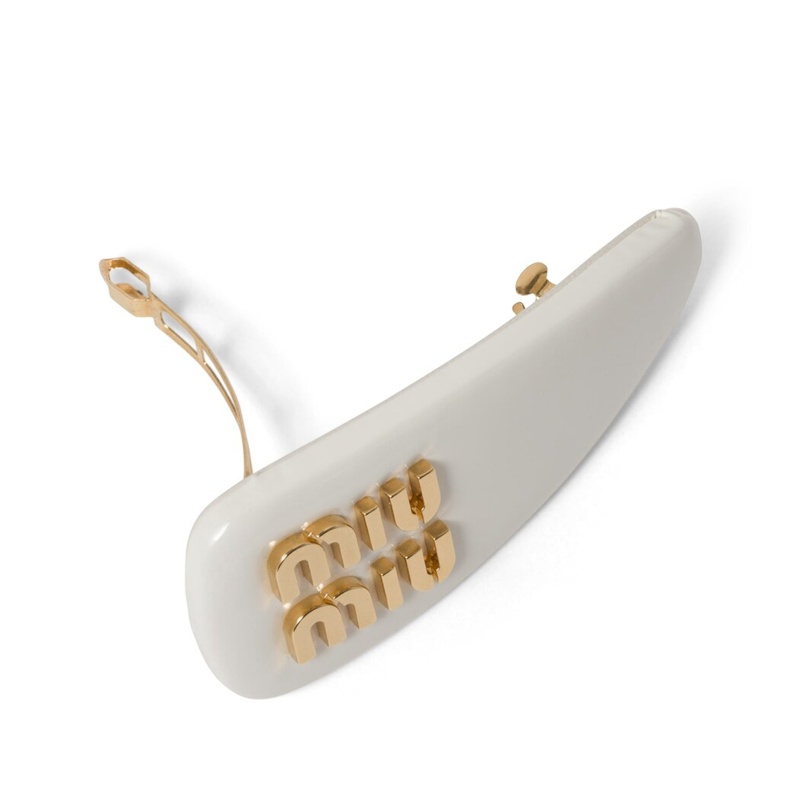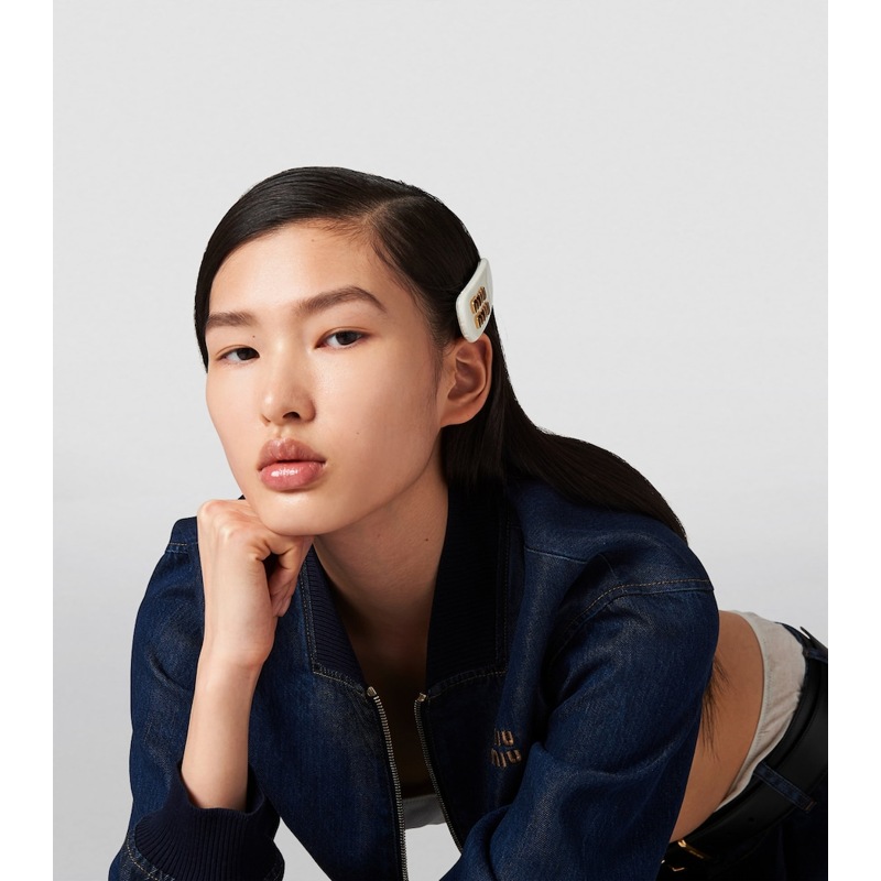 Trabalhada com precisão artesanal, a presilha combina a textura rica do couro com o brilho sutil das ferragens douradas, criando um contraste que adiciona profundidade a penteados casuais ou elaborados. Seja para segurar um coque despojado ou adornar cabelos soltos, esta peça é versátil o suficiente para transitar entre ocasiões diurnas e noturnas. O design reflete a habilidade da Miu Miu em unir nostalgia e modernidade, oferecendo um acessório que é ao mesmo tempo divertido e elegante.