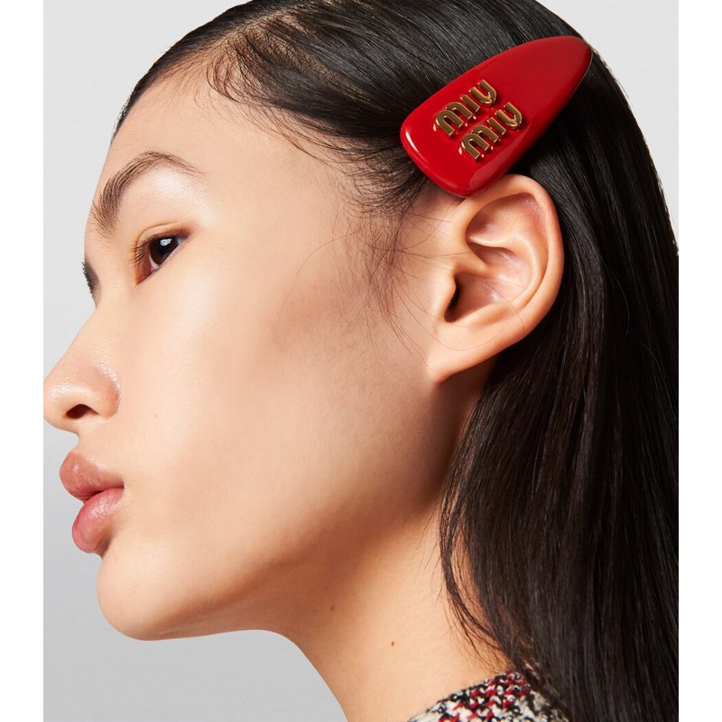 Trabalhada com precisão artesanal, a presilha combina a textura rica do couro com o brilho sutil das ferragens douradas, criando um contraste que adiciona profundidade a penteados casuais ou elaborados. Seja para segurar um coque despojado ou adornar cabelos soltos, esta peça é versátil o suficiente para transitar entre ocasiões diurnas e noturnas. O design reflete a habilidade da Miu Miu em unir nostalgia e modernidade, oferecendo um acessório que é ao mesmo tempo divertido e elegante.