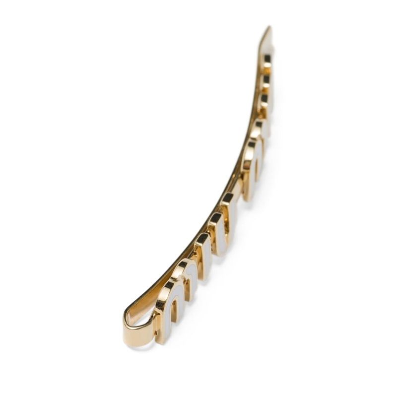 A Miu Miu eleva o minimalismo a novos patamares com seu grampo de cabelo com logotipo, uma peça que combina a estética jovial da marca com uma sofisticação discreta. Com ferragens douradas e um toque de esmalte, o logotipo da maison brilha como o toque final perfeito para qualquer visual, refletindo a energia vibrante das passarelas parisienses. Perfeito para adicionar um charme sutil a penteados, este grampo é ideal para quem busca um equilíbrio entre diversão e elegância.