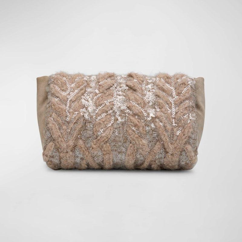 A Brunello Cucinelli Bolsa Clutch Sequined Opera Knit interpreta o estilo Clutch em design de mão, com perfil minimal com foco no acabamento. Com sem alça ou pulseira de mão.