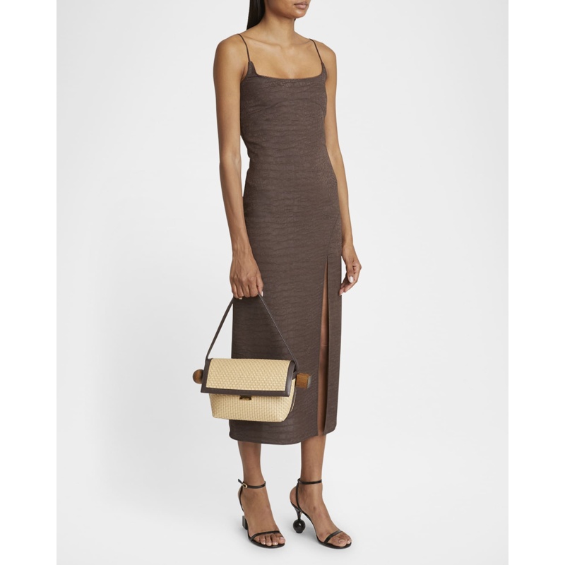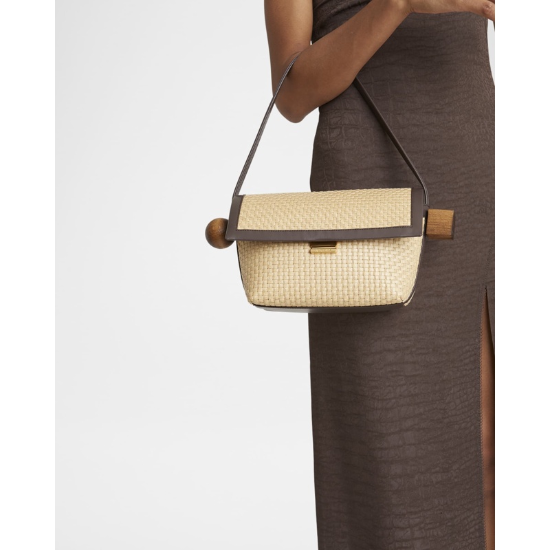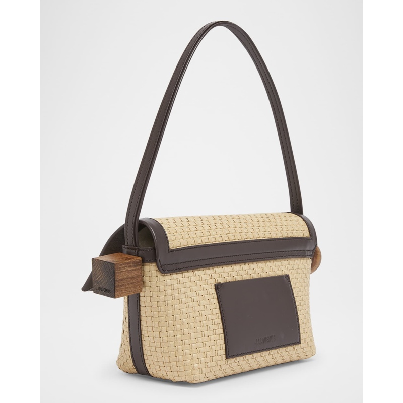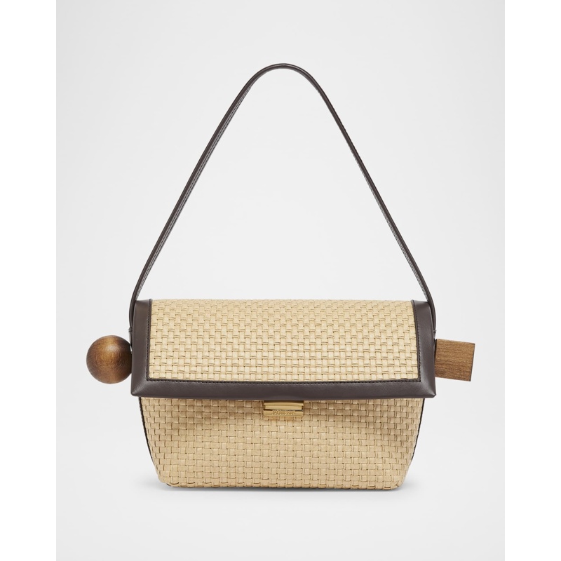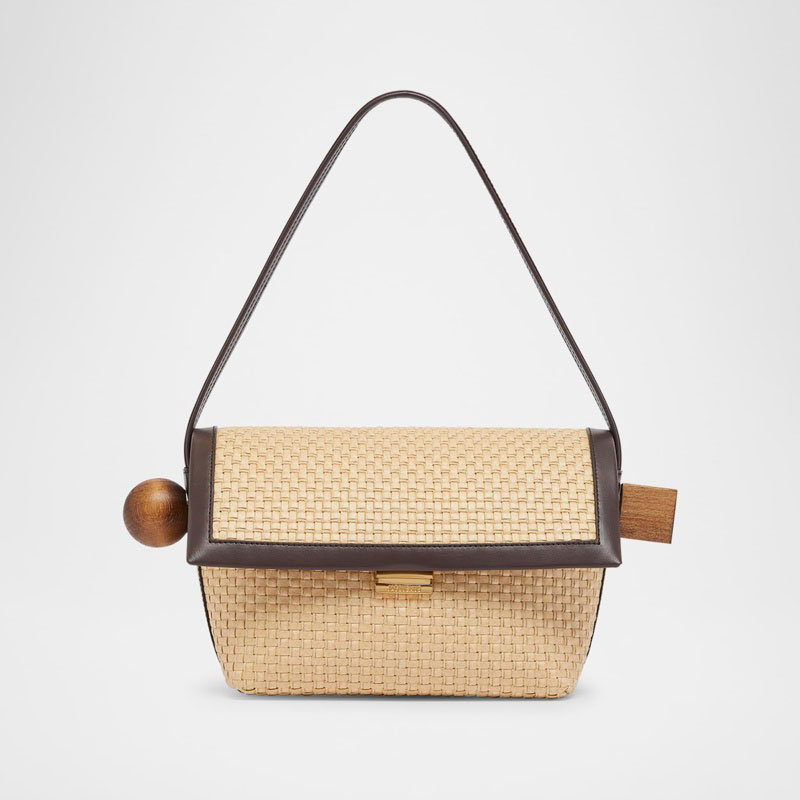 A Jacquemus Bolsa Beach Le Rond Geometric Raffia interpreta o estilo Beach em design de praia, com texturas naturais e leveza. Materiais como rafia/palha, com alça de ombro.