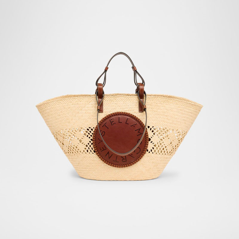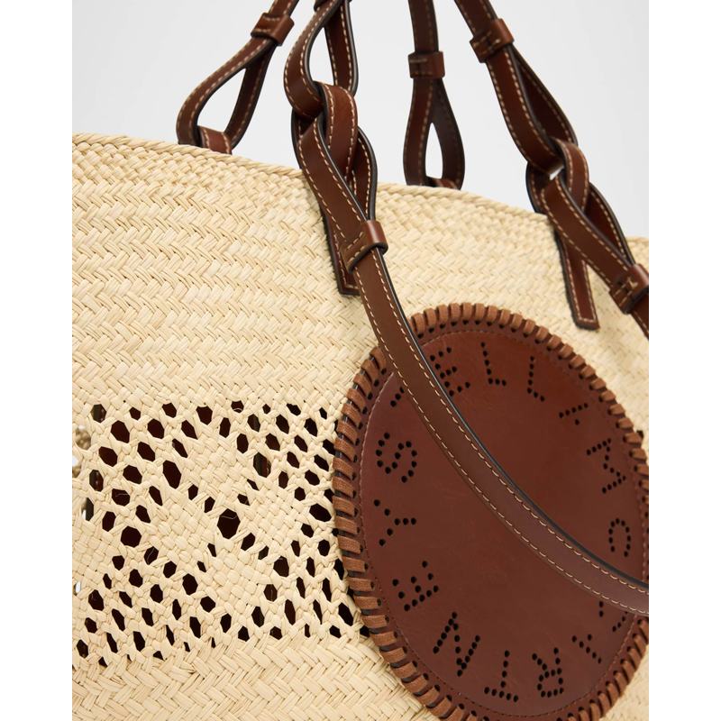 A Stella McCartney Bolsa Shopper Small Logo Raffia Basket interpreta o estilo Shopper em design de ombro, com volume generoso e linhas limpas. Materiais como rafia/palha, com alça de ombro, detalhes icônicos em monograma.