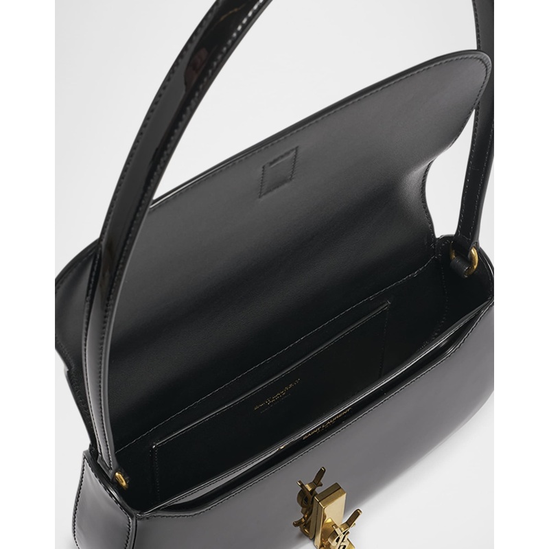 Confeccionada em couro envernizado (patent), acabamento envernizado, a peça ressalta monograma YSL em metal. Cai sob o ombro com fluidez e abraça bem casacos e malhas.