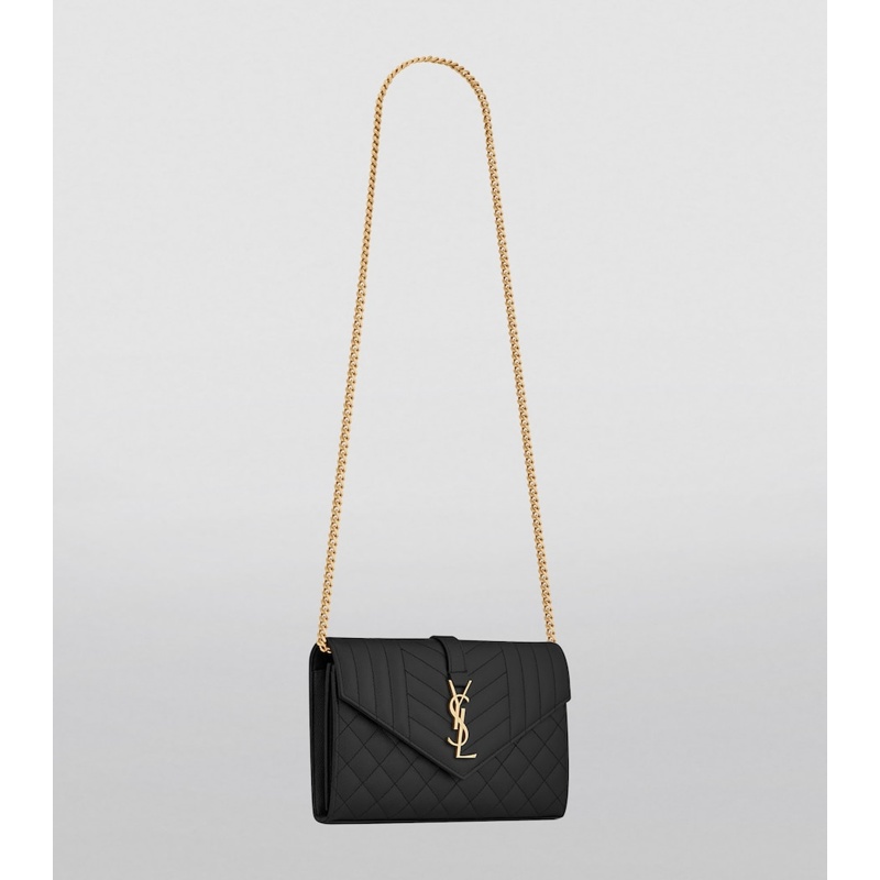 Produzida em materiais de alto padrão, recebe acabamento matelassê/acolchoado e destaca monograma YSL em metal e quilting em chevron. Compacta, organiza cartões e cédulas; algumas versões recebem corrente removível.