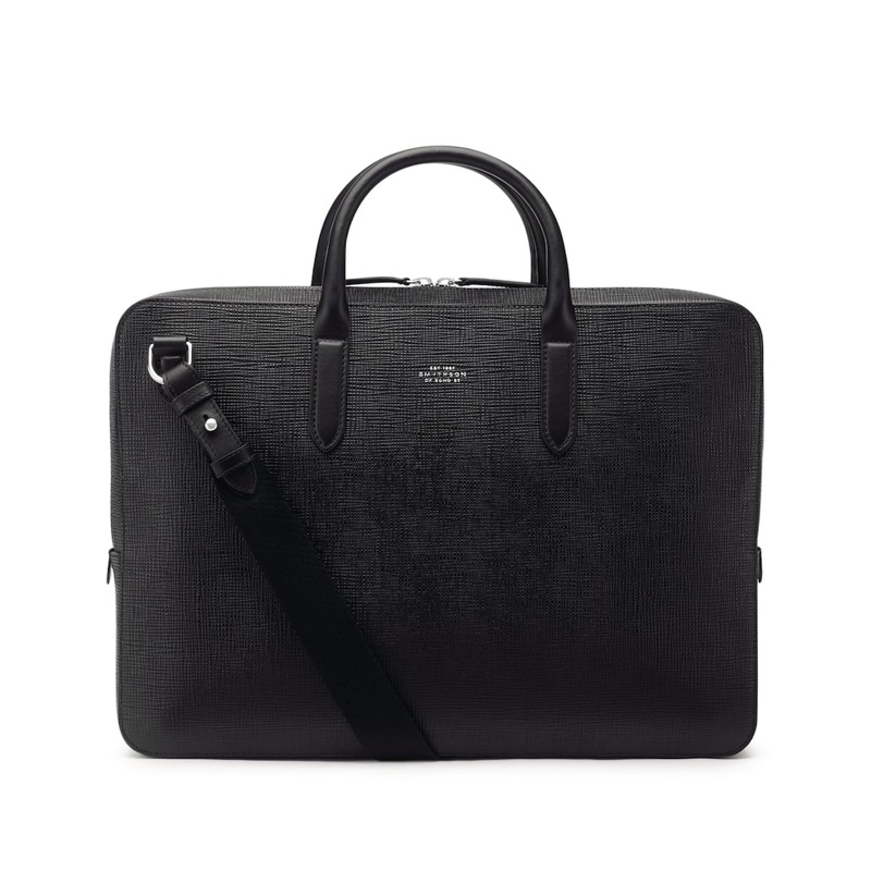 Assinada por Smythson, A Bolsa Messenger Brief é uma messenger em materiais de alto padrão, marcada por ferragens metalizadas de alto padrão.