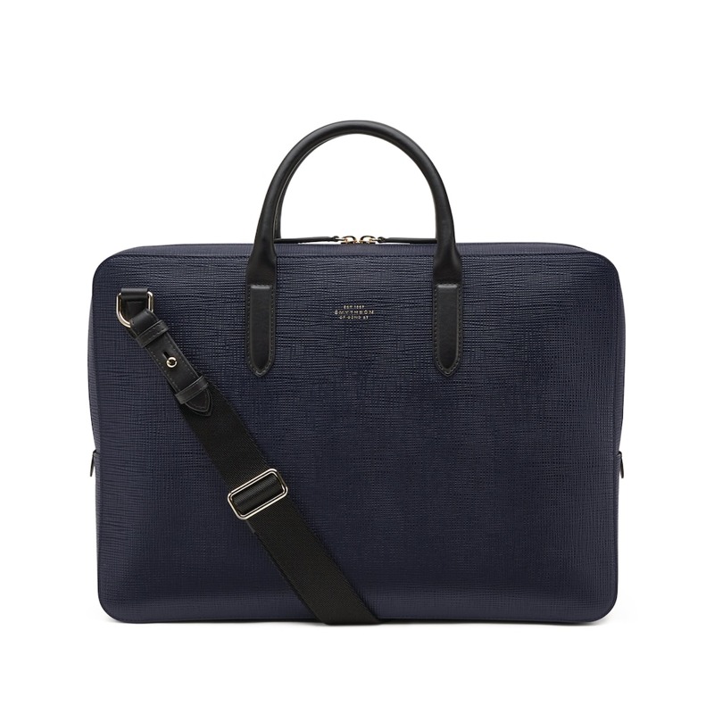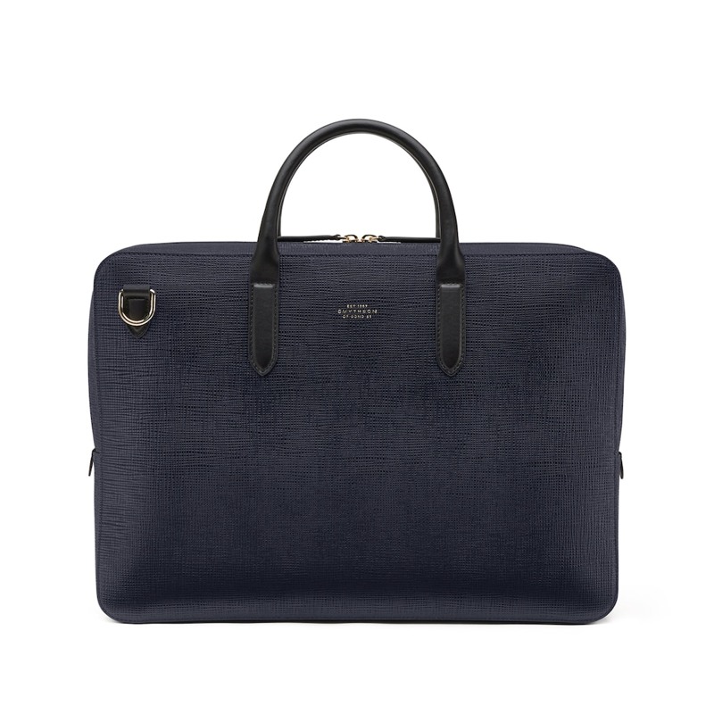 Assinada por Smythson, A Bolsa Messenger Brief é uma messenger em materiais de alto padrão, marcada por ferragens metalizadas de alto padrão.