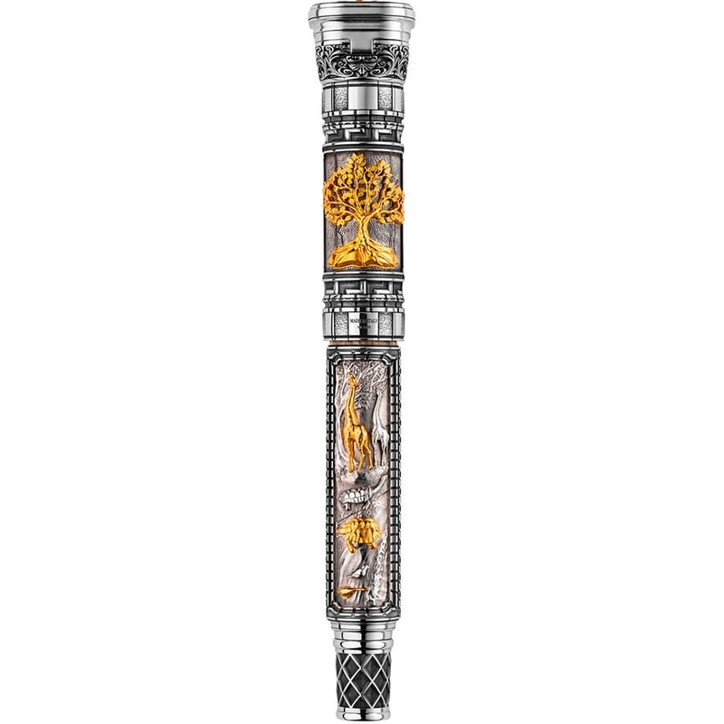 O corpo em resina verde escura, adornado com detalhes em bronze, evoca a natureza e a evolução. Gravuras detalhadas de fósseis e formas orgânicas, criadas por fundição por cera perdida, adornam a caneta, enquanto a pena em ouro 18K com ponta fina garante sofisticação.
