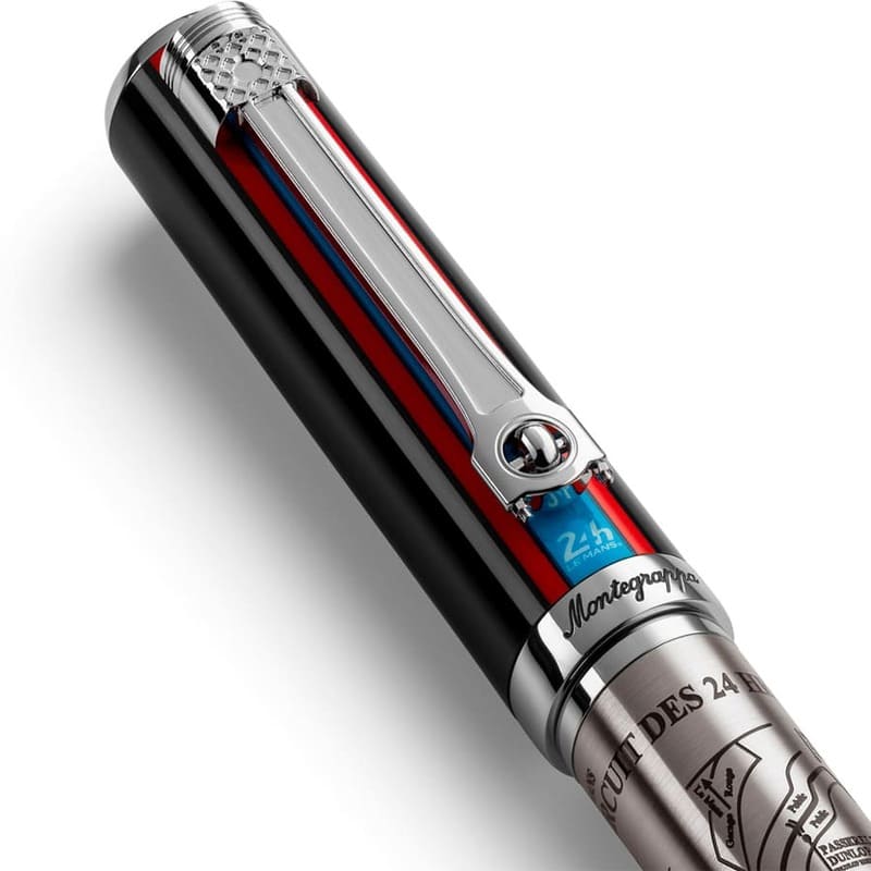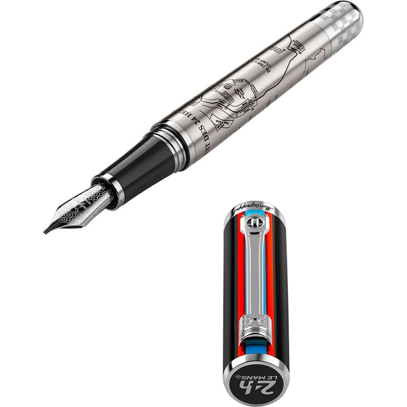 O corpo em resina preta com detalhes em prata esterlina evoca os carros de corrida clássicos. Gravuras inspiradas nas pistas de Le Mans, meticulosamente criadas por fundição por cera perdida, adornam a caneta. A pena em ouro 18K com ponta fina garante uma escrita elegante.