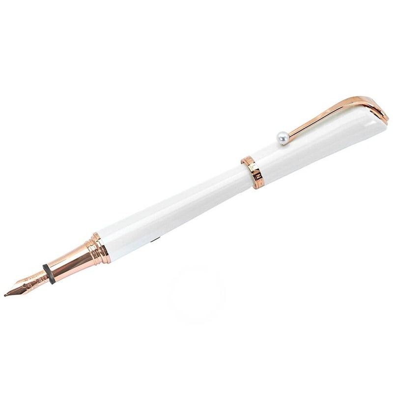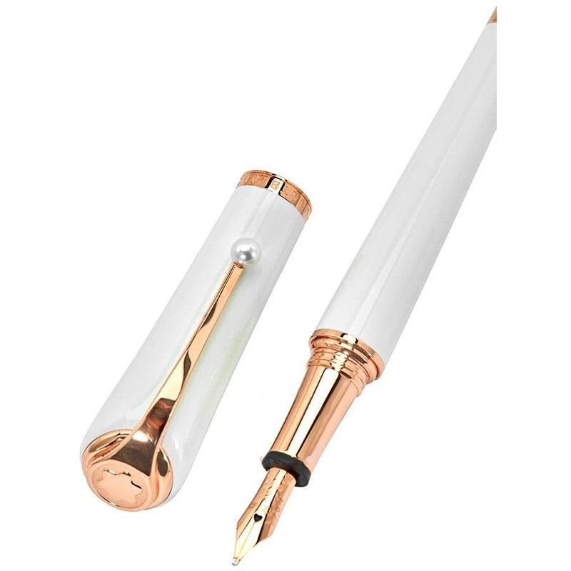 O corpo da caneta é feito de resina branca perolada, adornado com detalhes em ouro rosé, evocando as pérolas que Marilyn tanto amava. A pena em ouro 18K, com ponta fina e um motivo de coração delicadamente gravado, reflete seu charme inegável. A estrela Montblanc, símbolo da marca, coroa a peça com distinção.