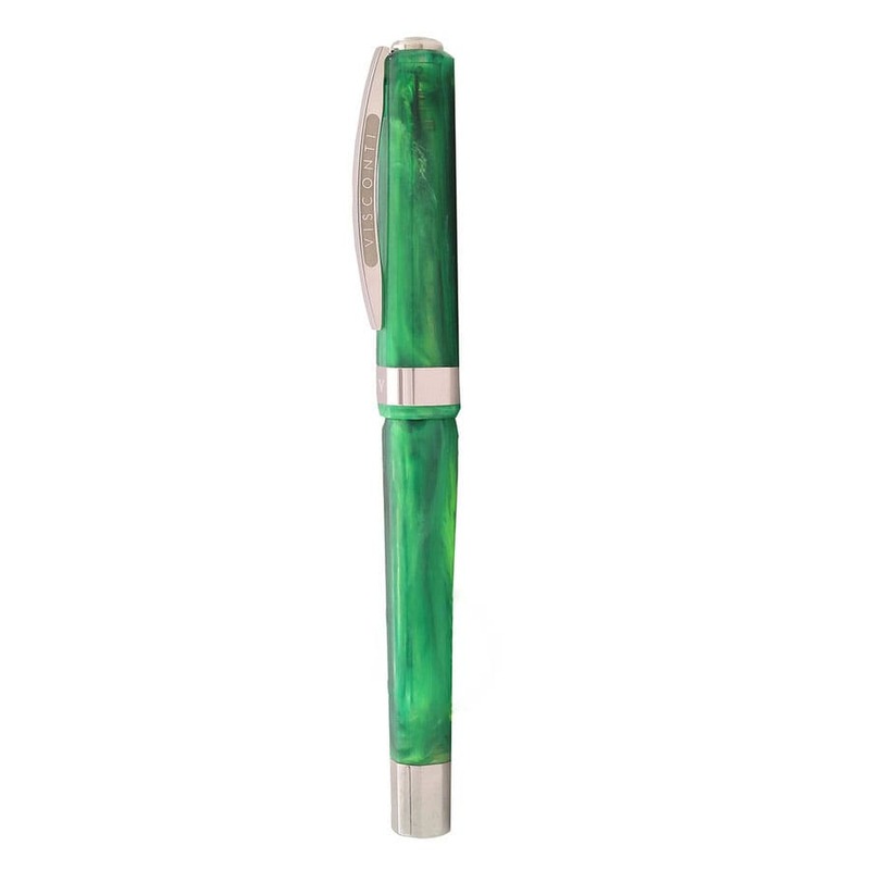 O corpo em resina acrílica transparente com tons verdes revela o mecanismo interno, criando um efeito visual cativante. Detalhes em metal cromado e o icônico clipe da Visconti adicionam sofisticação, enquanto a pena em ouro 18K com ponta fina garante elegância.