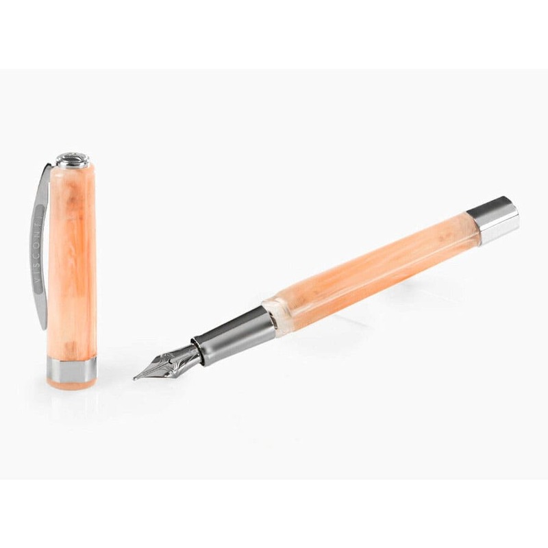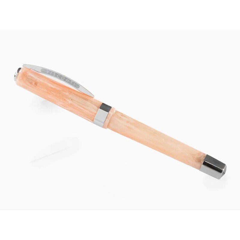 O corpo em resina acrílica transparente com tons rosa revela o mecanismo interno, criando um efeito visual cativante. Detalhes em metal cromado e o icônico clipe da Visconti adicionam sofisticação, enquanto a pena em ouro 18K com ponta larga garante expressividade.