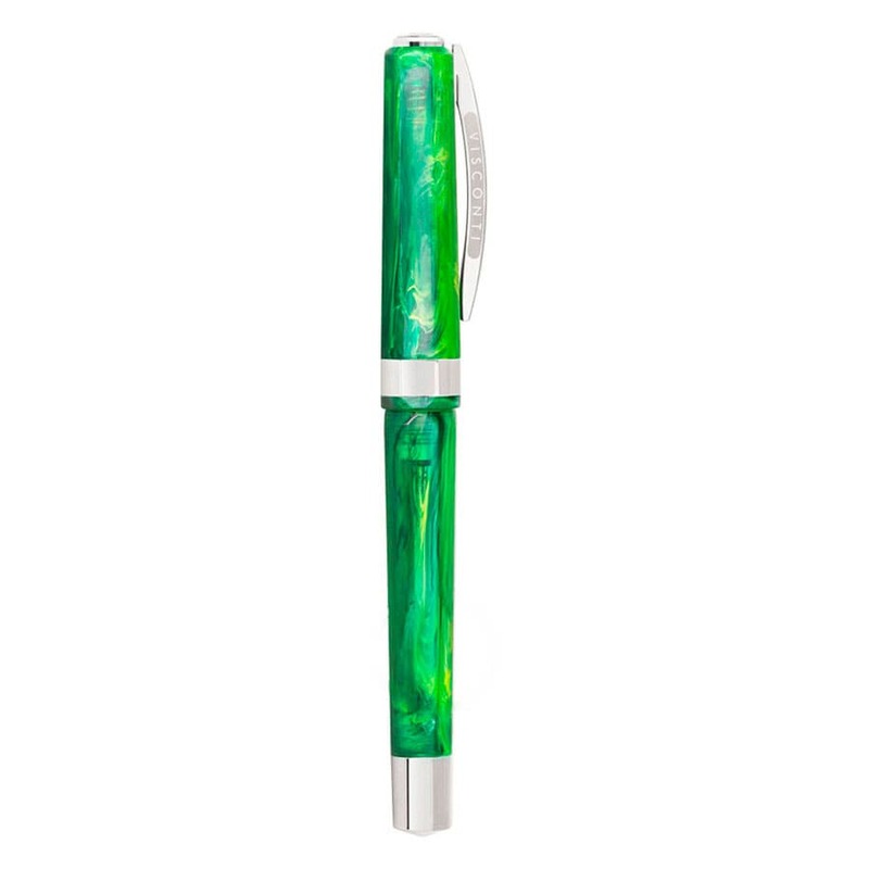 O corpo em resina acrílica transparente revela o mecanismo interno, criando um efeito visual cativante. Detalhes em metal cromado e o icônico clipe da Visconti adicionam sofisticação, enquanto a pena em ouro 18K com ponta média garante equilíbrio.