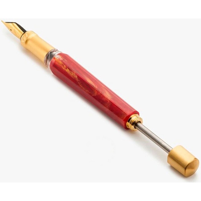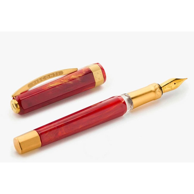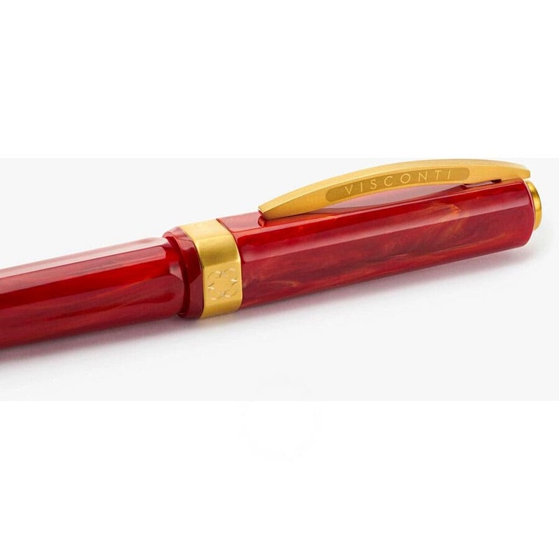 O corpo em resina vermelha brilhante, com detalhes em ouro, reflete sofisticação e vivacidade. A pena em ouro 18K com ponta fina e o clipe icônico da Visconti adicionam um toque de opulência.