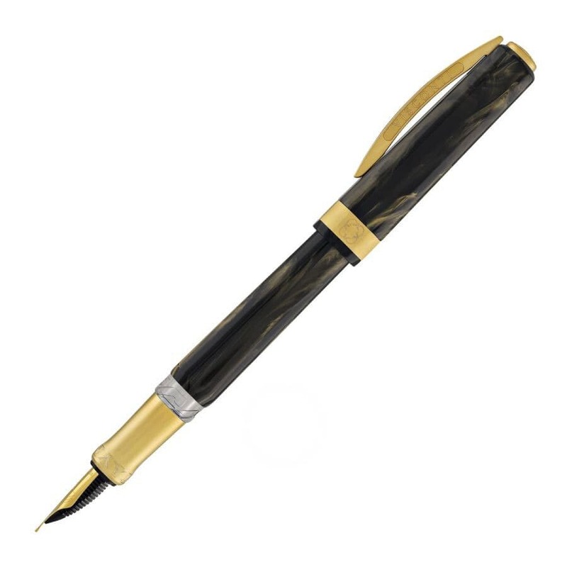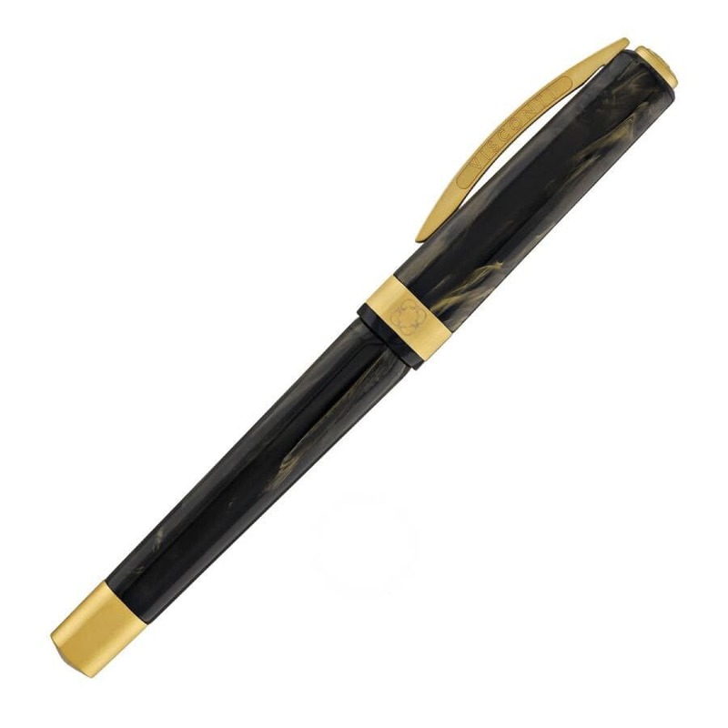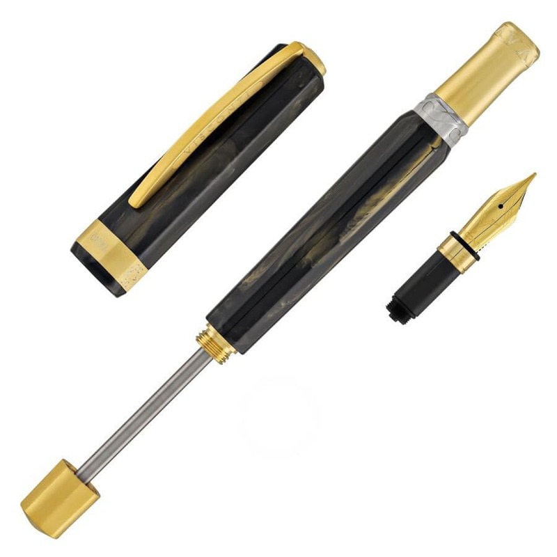 O corpo em resina preta brilhante, com detalhes em ouro, exala sofisticação atemporal. A pena em ouro 18K com ponta média e o icônico clipe da Visconti adicionam um toque de opulência.