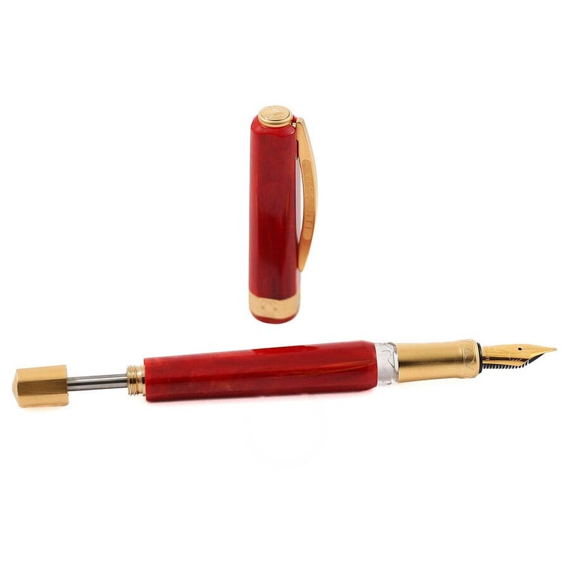O corpo em resina vermelha brilhante, com detalhes em ouro, reflete sofisticação e vivacidade. A pena em ouro 18K com ponta média e o clipe icônico da Visconti adicionam um toque de opulência.