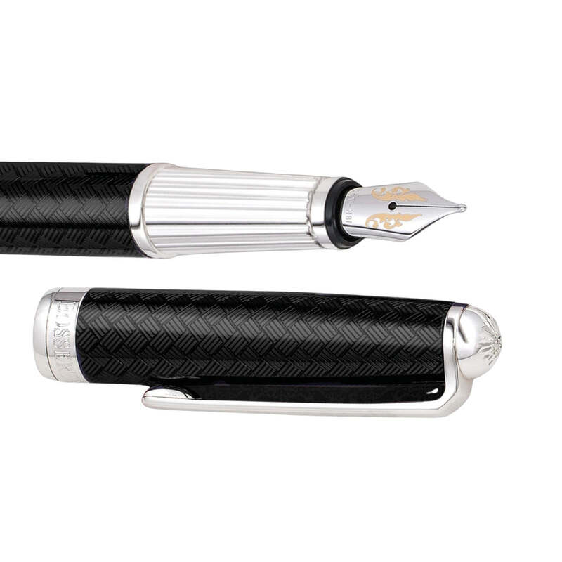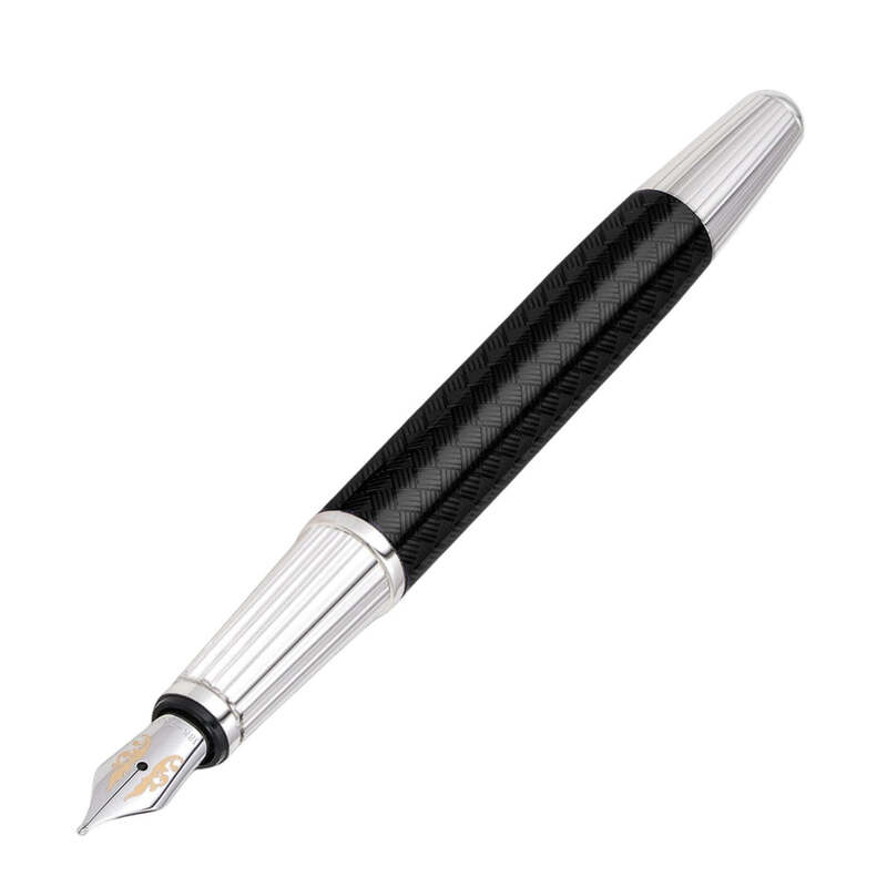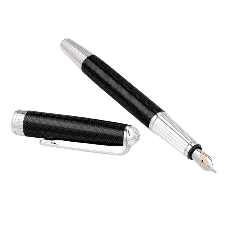 O corpo em resina preta brilhante, com detalhes em metal cromado, exala sofisticação atemporal. A pena em ouro 18K com ponta média garante elegância e precisão.