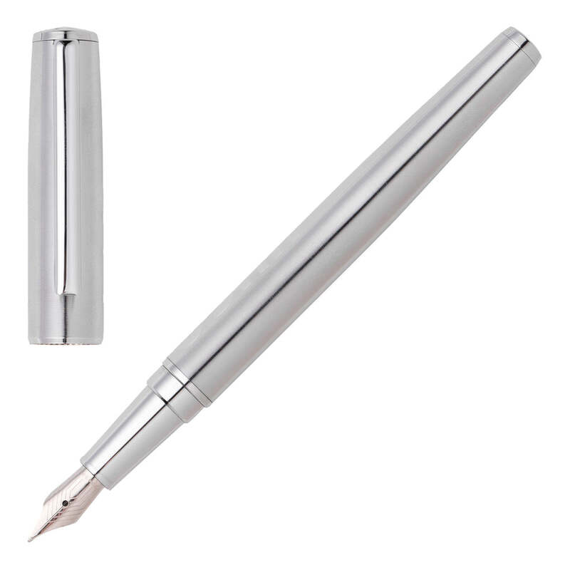 A Hugo Boss Caneta Tinteiro Label Chrome celebra a escrita tinteiro com proporções equilibradas e refinamento técnico.