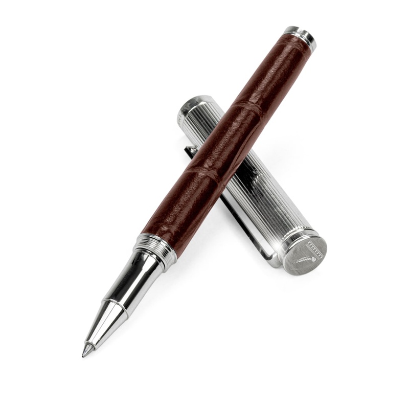 A caneta esferográfica London da Aspinal of London é um exemplo excepcional de trabalho artesanal meticuloso, durabilidade e refinamento. Cada caneta é feita à mão em latão banhado a ródio e revestida com couro fino de grão integral, enquanto a tampa da caneta tem acabamento em prata de lei 925. É o presente perfeito para apreciadores da caligrafia.