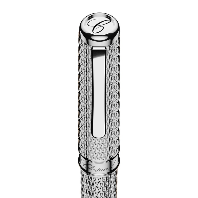 Para descobrir a experiência mais agradável com a escrita à mão, todo escritor merece experimentar o requintado artesanato de uma caneta Chopard. Esta esferográfica clássica tem uma estrutura elegante e assertiva, com um padrão de diamante gravado para garantir que você mantenha uma pegada firme ao escrever e assinar. A caneta evoca a expertise da Casa Suíça em alta relojoaria com sua precisão, delicadamente gravada com o nome da marca ao redor da tampa.