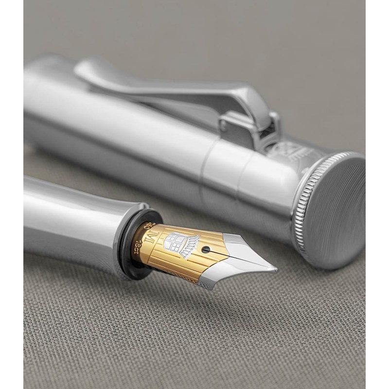 A coleção Classic da Graf von Faber-Castell combina tipicamente o carisma natural e acolhedor da madeira com a elegância suave dos acabamentos banhados a platina, mas esta versão apresenta um corpo banhado a platina para um toque mais tradicional. A caneta-tinteiro artesanal apresenta a mesma estrutura de ranhuras em filigrana dos desenhos em madeira, enquanto a pena bicolor em ouro 18 quilates cria uma caligrafia verdadeiramente satisfatória.