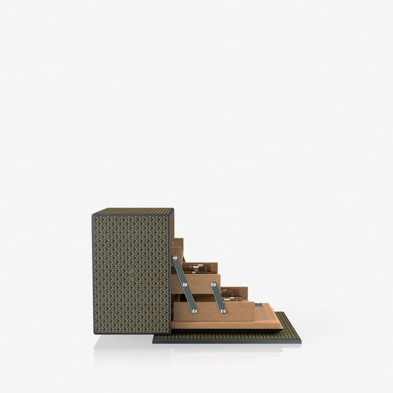 A tecnologia de vedação do Umidor Coated Canvas Mocaccino assegura um microclima estável, enquanto seu interior é revestido com madeira nobre — elemento essencial para um envelhecimento natural e equilibrado das folhas. Este cuidado minucioso garante que cada charuto seja degustado como pretendido pelo mestre tabaqueiro.