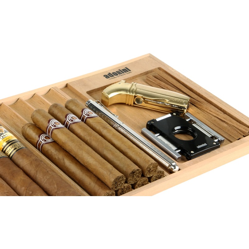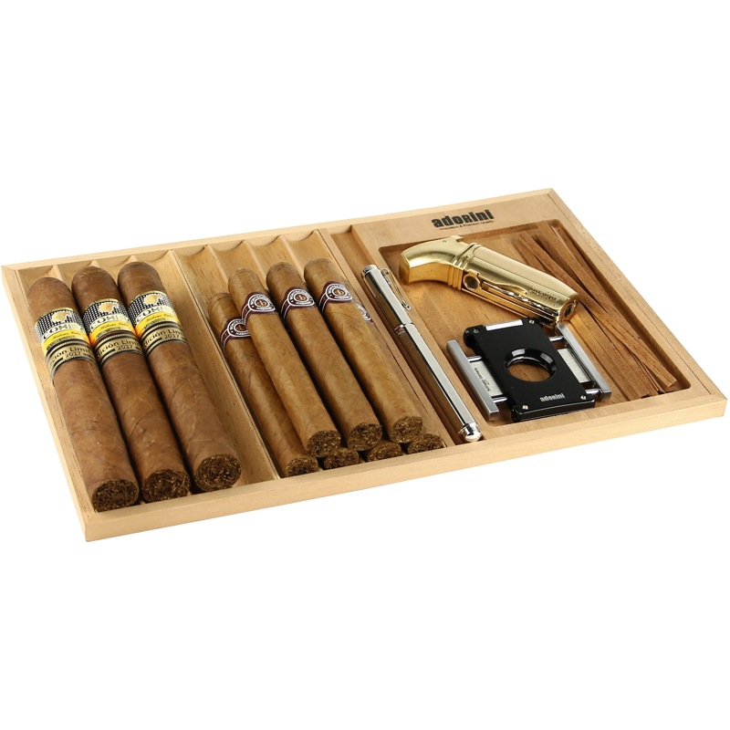 Fabricado com materiais de altíssima qualidade, como madeiras nobres e acabamentos de precisão, a Bandeja de serviço de charuto Adorini proporciona um ambiente controlado que mantém a umidade uniforme, evitando deformações ou alterações no sabor dos charutos. Sua construção robusta assegura longa durabilidade e um toque de sofisticação.