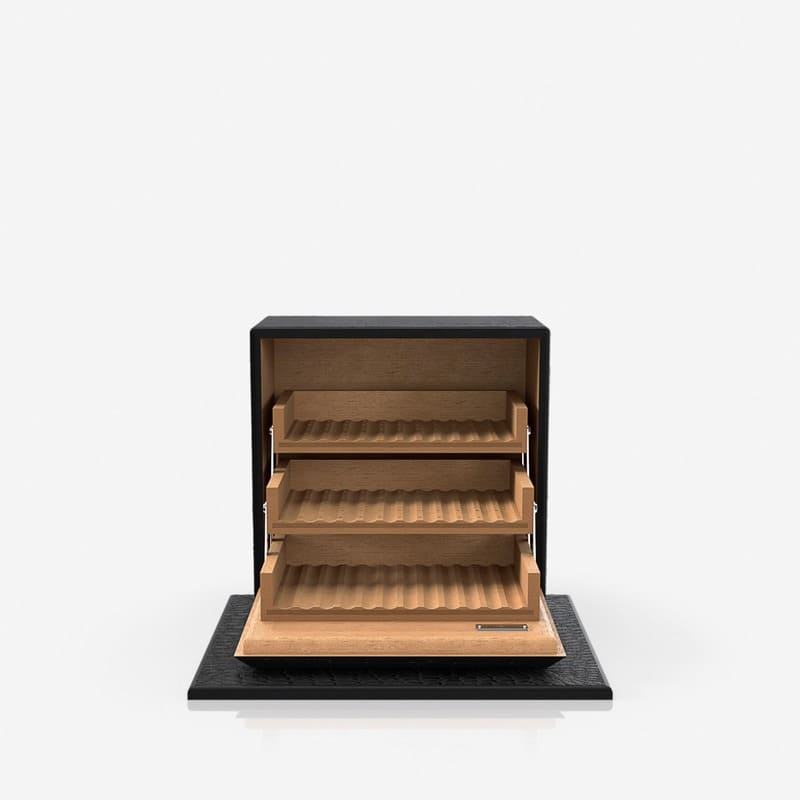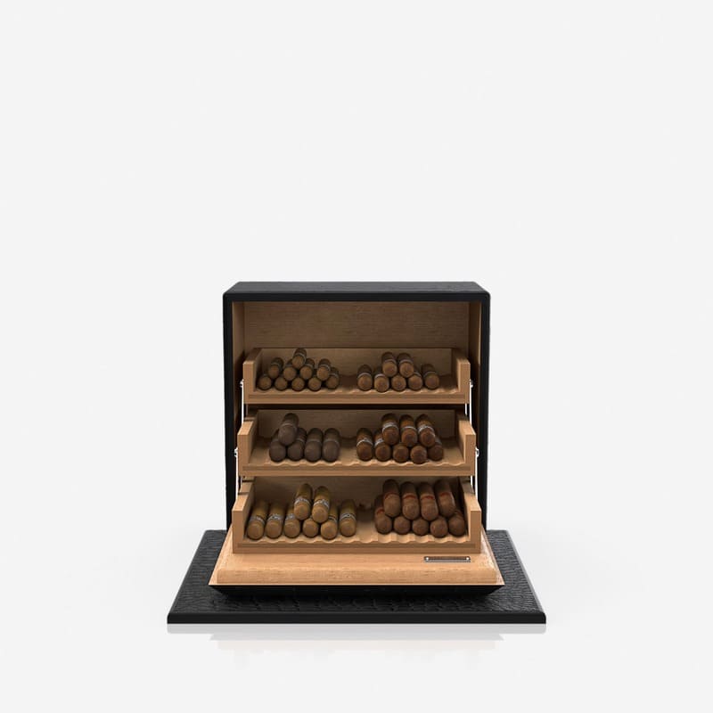 A tecnologia de vedação do Umidor Alligator Preto Cr assegura um microclima estável, enquanto seu interior é revestido com madeira nobre — elemento essencial para um envelhecimento natural e equilibrado das folhas. Este cuidado minucioso garante que cada charuto seja degustado como pretendido pelo mestre tabaqueiro.