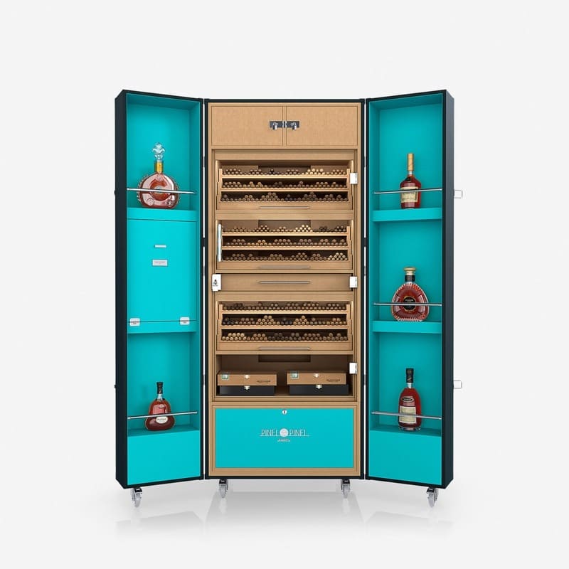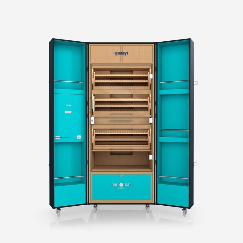 O Umidor Ultimate Trunk Calfskin Azul e Interior Turquesa da Pinel & Pinel é uma peça de excelência artesanal, desenvolvida para oferecer o ambiente perfeito para a preservação de charutos premium. Seu design combina funcionalidade avançada e estética refinada, tornando-o não apenas um acessório, mas também um símbolo de sofisticação para o apreciador exigente.