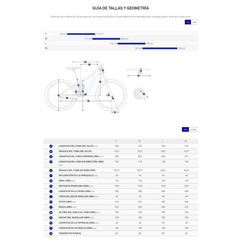 • Especificações Principais Quadro: Alumínio Aluxx SL-Grade, Sistema de Suspensão Flexpoint com Curso de 125 mm, Eixo Traseiro 148X12, Ganchos de Câmbio UDH, Amortecedor 184X44, Caixa de Direção 1.5~1.8 Garfo: SR Suntour XCR 34 LO-R, Curso de 140 mm, Espiga Cônica, Trava, Eixo Passante 110X15 Amortecedor Traseiro: SR Suntour Raidon R, 190X45 mm, Afundamento Recomendado: 30% Motor: Giant SyncDrive Sport2, 75 Nm, Tecnologia PedalPlus com 6 Sensores Bateria: Giant EnergyPak 500 Wh, Revestimento de Alumínio com o Mais Alto Padrão de Segurança (EN50604), Produção Neutra em CO2, Compatível com Extensor de Autonomia Giant EnergyPak Plus 250 Conjunto de Transmissão Câmbio Dianteiro: Guia de Corrente Co-Moldado MRP HD2 Câmbio Traseiro: Shimano Deore LinkGlide, 10 Velocidades Alavancas de Câmbio: Shimano Deore LinkGlide Pedivela: Conjunto de Braços de Pedivela Fsa Comet E-Bike Fsa Megatooth Direct-Mount 1X Aço 36D Cassete: Shimano LinkGlide, CS-LG400-10, 11-43D, 10 Velocidades Freio Dianteiro: Tektro HD-M745 Orion, 4 Pistões, Disco Hidráulico, 203 mm Freio Traseiro: Tektro HD-M745 Orion, 4 Pistões, Disco Hidráulico, 203 mm Corrente: Shimano, LinkGlide, CN-LG500 Rodas Aros: Giant AM30, Tubeless Ready, Largura Interna de 30 mm, 29 Pneus: Maxxis Minion DHF 29X2.50 Dobrável, TLR, Exo, 60 TPI [D] Maxxis Dissector 29X2.40 WT Dobrável, TLR, Exo, 60 TPI [T] Componentes Guidão: Giant Connect TR Riser 31.8X780 mm Mesa: Giant Contact Selim: Giant Sport Canote do Selim: Giant 30.9 mm, Microajustável com 2 Parafusos, Alumínio Forjado Pedais: Plataforma de Alumínio