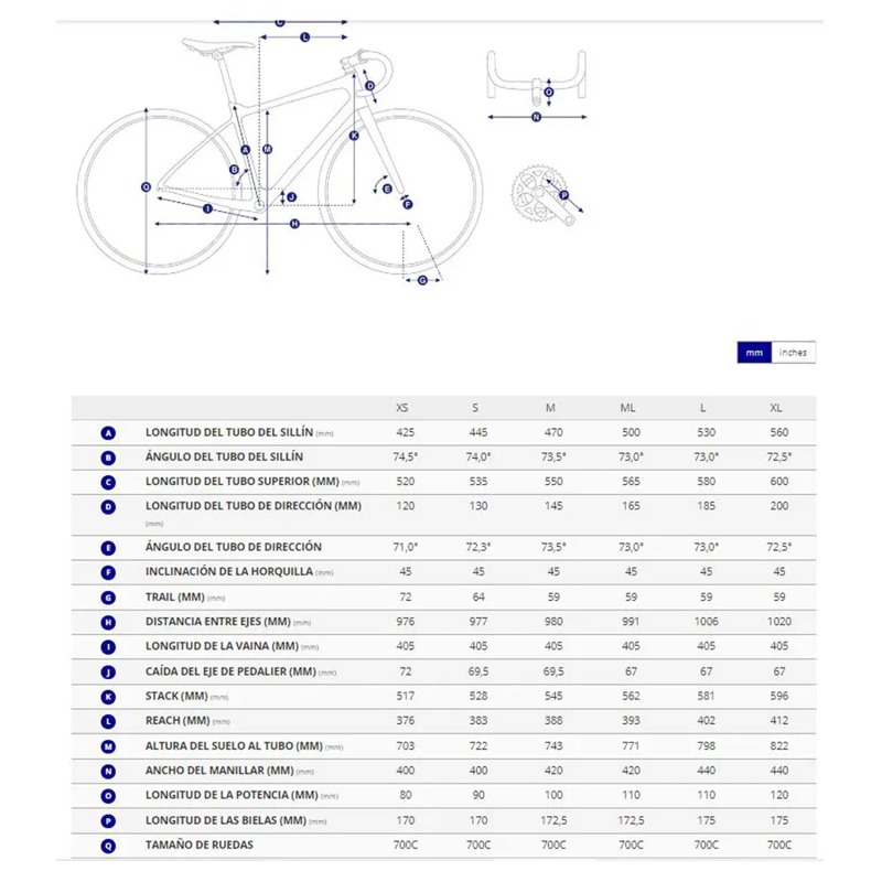 • Tradução para Português: Especificações Principais Quadro: Composto de grau avançado, eixo passante de 12x142mm, freio a disco Garfo: Composto de grau avançado SL, espiga Overdrive Aero totalmente em composto, eixo passante de 12x100mm, freio a disco Grupo Câmbio dianteiro: Shimano Ultegra Di2 FD-R8150 Câmbio traseiro: Shimano Ultegra Di2 RD-R8150 Trocadores: Shimano Ultegra Di2 Pedivela: Shimano Ultegra, 36/52 com medidor de potência Giant Power Pro XS:170mm, S:170mm, M:172.5mm, M/L:172.5mm, L:175mm, XL:175mm Cassete: Shimano Ultegra, 12 velocidades, 11x34 Freio dianteiro: Shimano Ultegra Di2 hidráulico, rotores Shimano RT-CL800 [D]160mm, [T]140mm Freio traseiro: Shimano Ultegra Di2 hidráulico, rotores Shimano RT-CL800 [D]160mm, [T]140mm Corrente: Shimano CN-M8100 Movimento central: Shimano, Press Fit Rodas Aros: Sistema de rodas Giant SLR 0 40, [D]40mm, [T]40mm Pneus: Cadex Race GC, Tubeless, 700x28C (28mm), dobrável Componentes Guidão: Giant Contact SLR XS:39/40cm, S:39/40cm, M:39/42cm, M/L:39/42cm, L:41/44cm, XL:41/44cm Mesa: Giant Contact SL Aerolight XS:80mm, S:90mm, M:100mm, M/L:110mm, L:110mm, XL:120mm Selim: Giant Fleet SL Canote: Giant Variant, composto, offset -5/+15mm