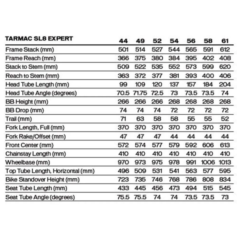 • Especificações principais Quadro: Tarmac Sl8 Fact 10R Carbon, Rider First Engineered™, Win Tunnel Engineered, Clean Routing, Threaded Bb, 12X142Mm Thru-Axle, Flat-Mount Disc Fork: Tarmac Sl8 Fact 10R Carbon, 12X100Mm Thru-Axle, Flat-Mount Disc Grupo Desviador: Sram Rival Etap Axs, Braze-On Desviador traseiro: Sram Rival Etap Axs, 12-Speed Trocadores: Sram Rival Etap Axs Movimento central: Sram Rival With Power Meter Correntes: 48/35T Cassette: Sram Rival, 12-Speed, 10-36T Freio dianteiro: Sram Rival Etap Axs, Hydraulic Disc Freio traseiro: Sram Rival Etap Axs, Hydraulic Disc Corrente: Sram Rival 12-Speed Movimento central: Sram Dub Bsa 68 Rodas Aros: Roval C38, 21Mm Internal Width Carbon Rim Pneus: S-Works Turbo, Folding Bead, 700X26Mm Componentes Guidão: Specialized Expert Shallow Drop, Alloy, 125Mm Drop X 75Mm Reach Mesa: Tarmac Integrated Stem, 6-Degree Selim: Body Geometry Power Expert Canote: S-Works Tarmac Sl8 Carbon Seat Post, Fact Carbon, 15Mm Offset Peso: 7,77 Kg (17 Lb, 2,1 Oz) Tamanho: 56Cm