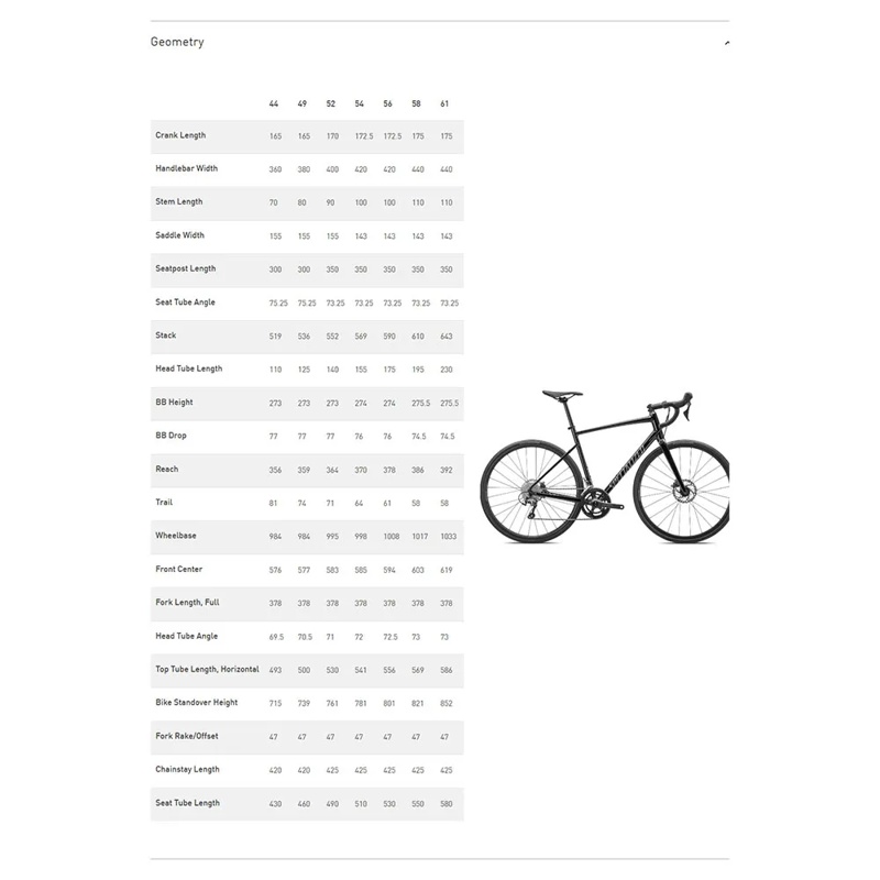 • Tradução: Especificações Principais Quadro: Alumínio Premium Specialized E5, Freio a Disco Flat Mount, Suportes para Bagageiro e Pára-lamas, Tubos Totalmente Manipulados com Smoothwelds, Roteamento Interno de Cabos, Movimento Central Roscado, Eixo Passante 12x142mm Garfo: Specialized FACT Full Carbon, Freio a Disco Flat Mount, Espiga Cônica 1-1/8 a 1-3/8, Suportes para Pára-lamas, Eixo Passante 12x100mm Grupo Câmbio Dianteiro: Shimano Tiagra, Braze-On Câmbio Traseiro: Shimano Tiagra, 10 velocidades Alavancas de Câmbio: Shimano Tiagra Disc 4720, 10 velocidades Pedivela: Praxis Alba - 50/34D Coroas: 50/34D Cassete: Sunrace, 10 velocidades, 11-32D Freio Dianteiro: Shimano Tiagra, Disco Hidráulico - Rotor 160mm Freio Traseiro: Shimano Tiagra, Disco Hidráulico - Rotor 160mm Corrente: Kmc X10, 10 velocidades Movimento Central: Praxis 68mm BSA Rodas Aros: Axis Sport Disc Pneus: Specialized Roadsport, 700x30C Componentes Guidão: Specialized Shallow Drop, 70x125mm, 31.8mm de aperto Mesa: Liga de Alumínio Forjada 3D, 31.8mm, 7 graus de elevação Selim: Body Geometry Bridge Saddle, Trilhos de Aço Canote: Liga de Alumínio, Abraçadeira de 2 Parafusos, 12mm de recuo, 27.2mm, Ferragens Anti-Corrosão Peso: 9.04 kg (19 lb, 14.9 oz) Tamanho: 56
