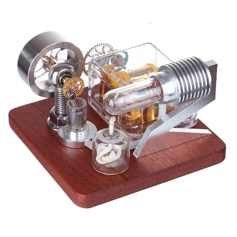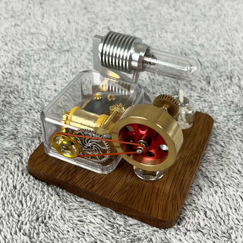 O motor Stirling, inventado no século XIX, é uma máquina termodinâmica que converte calor em energia mecânica por meio de um ciclo fechado de compressão e expansão de gases em diferentes temperaturas. Quando o ar dentro do cilindro é aquecido, ele se expande e move o pistão; ao esfriar, o ar se contrai, reiniciando o processo. Esse ciclo contínuo e silencioso transforma energia térmica em movimento, criando uma coreografia hipnótica de engrenagens e volantes.