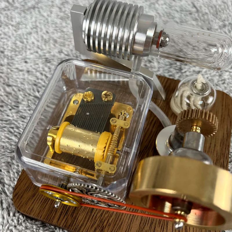 Neste modelo especial, o movimento do motor é conectado a um conjunto de cames que acionam a caixa de música, transformando o calor em uma melodia suave e relaxante. O resultado é um espetáculo de precisão mecânica que transcende a função técnica, trazendo poesia e emoção ao ambiente.